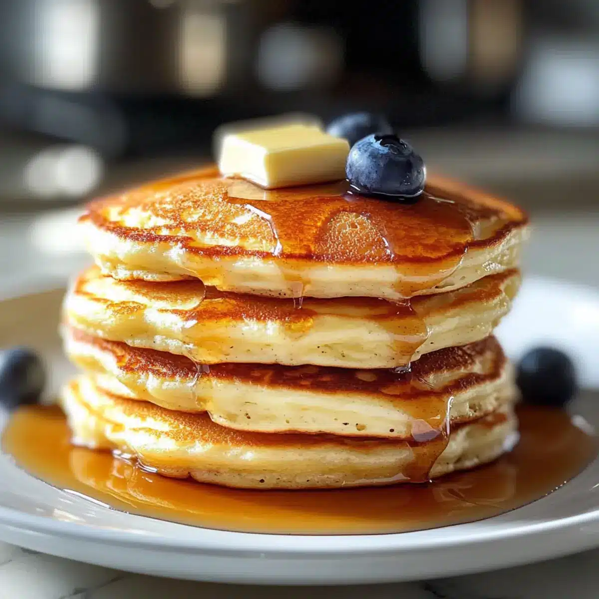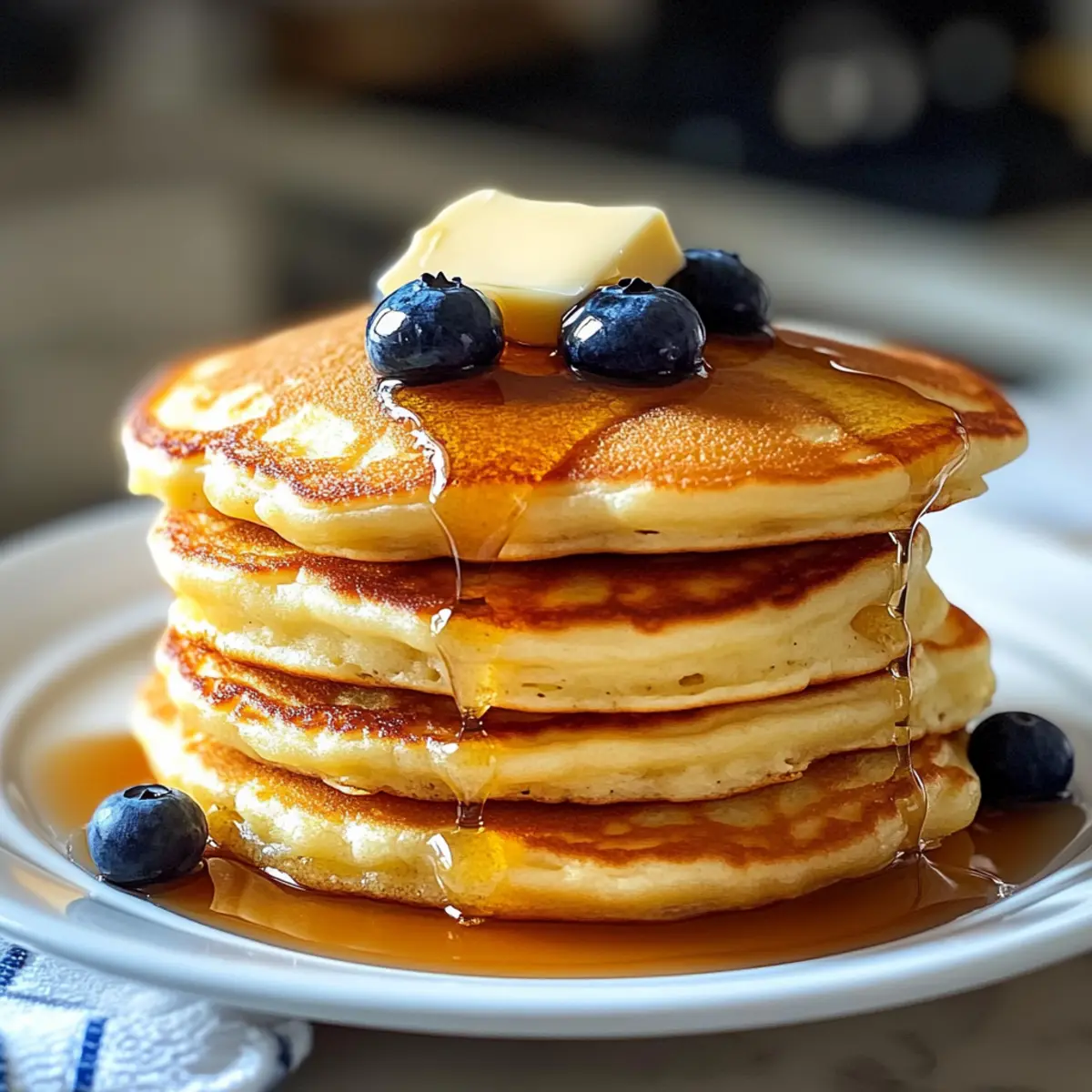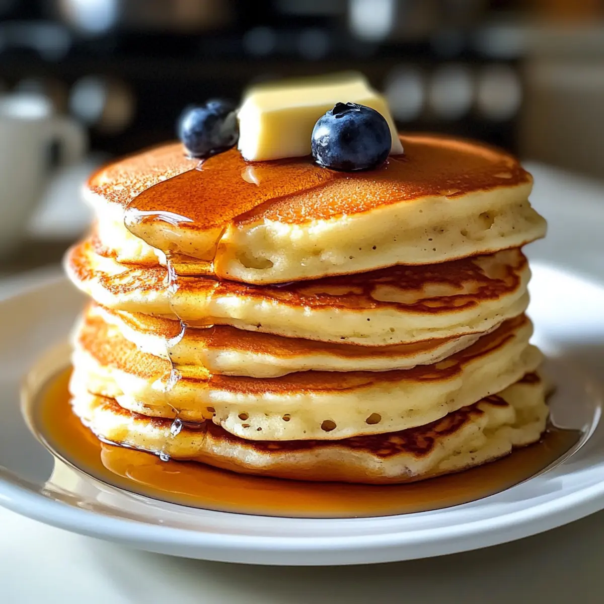 - Frisch gebackene Pfannkuchen auf einem warmen Teller stapeln und nach Belieben servieren.