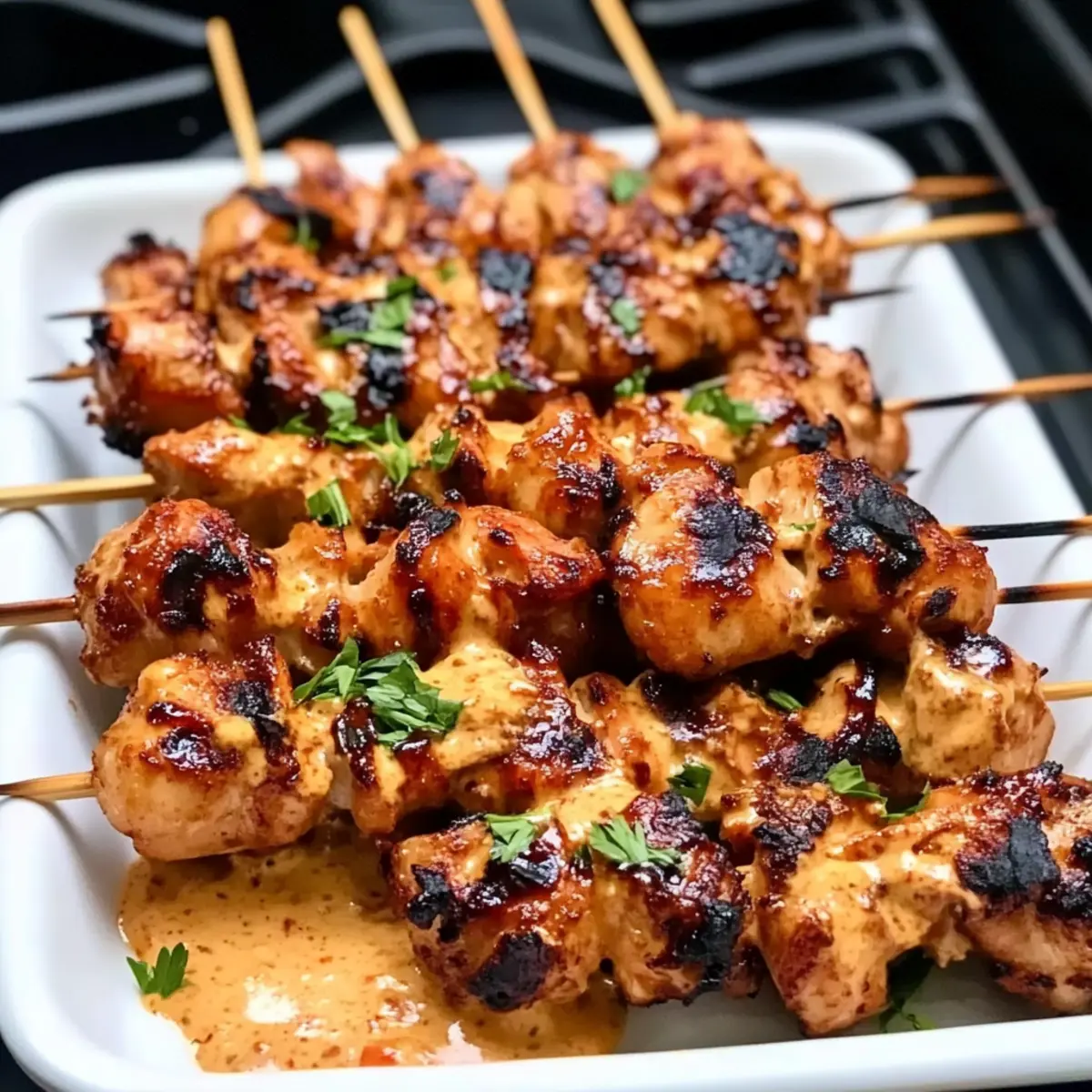 - Servieren: Bestreiche die Spieße kurz vor dem Servieren mit zusätzlicher Bang Bang Sauce. Mit Petersilie oder Sesamsamen garnieren.