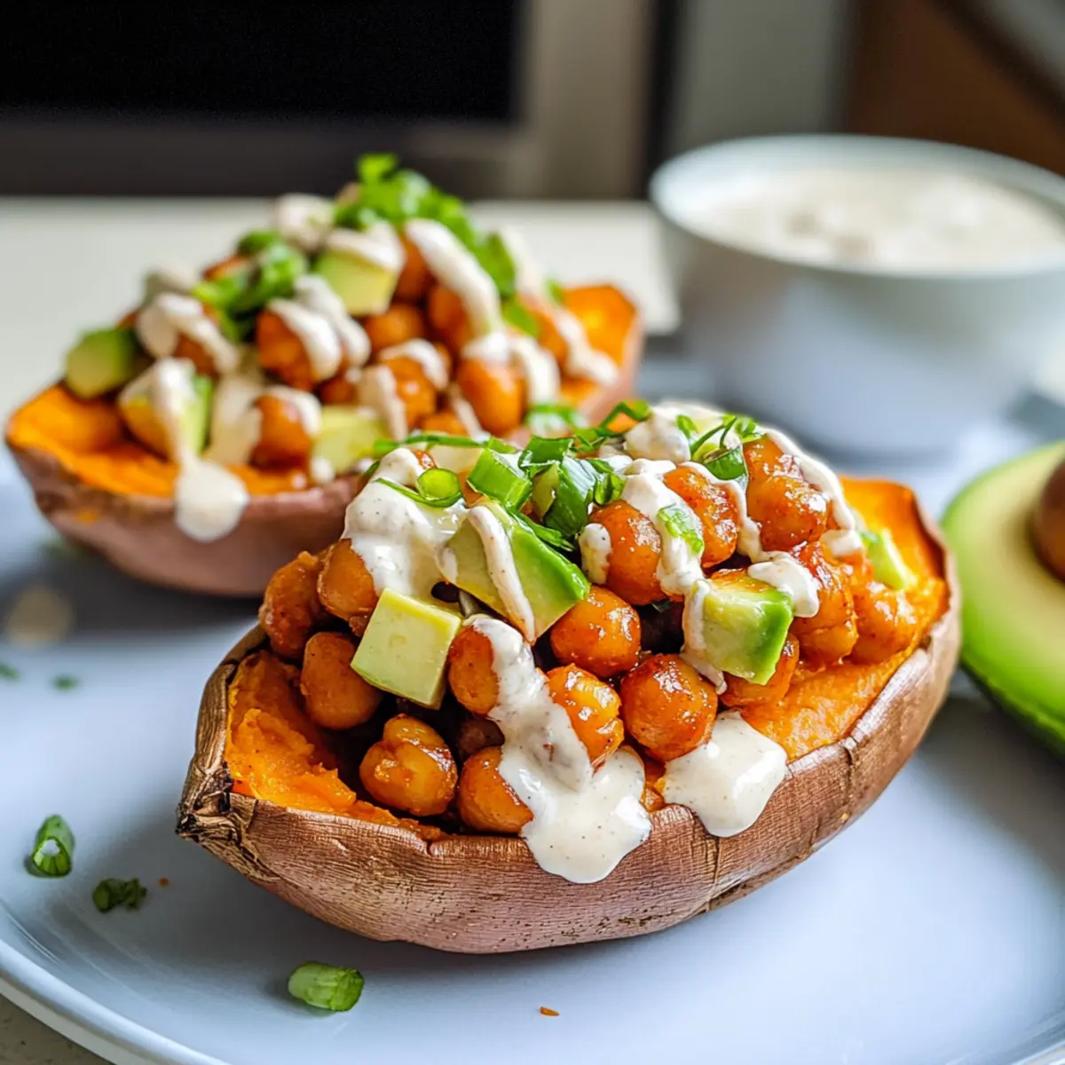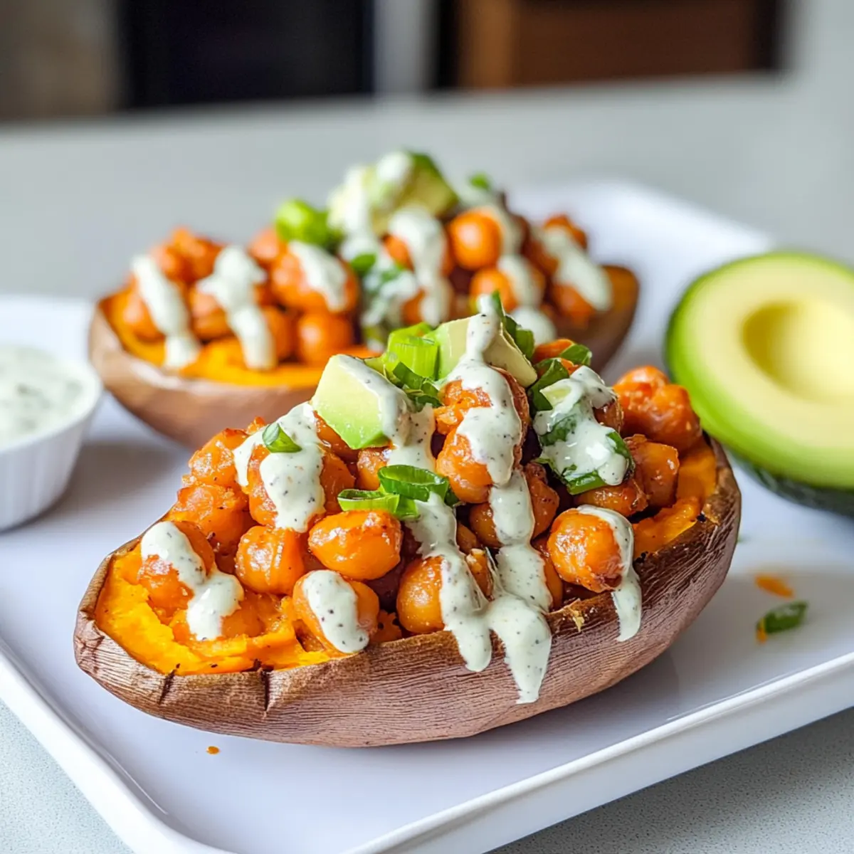 Sobald die Süßkartoffeln fertig gebacken sind, schneide sie vorsichtig der Länge nach auf und drücke die Seiten leicht auseinander. Fülle jede Süßkartoffel mit der würzigen Buffalo Kichererbse Mischung. Belege sie mit einigen Scheiben Avocado und gehackten grünen Zwiebeln. Träufle zum Schluss das cremige vegane Ranch-Dressing darüber und genieße dein köstliches Gericht!