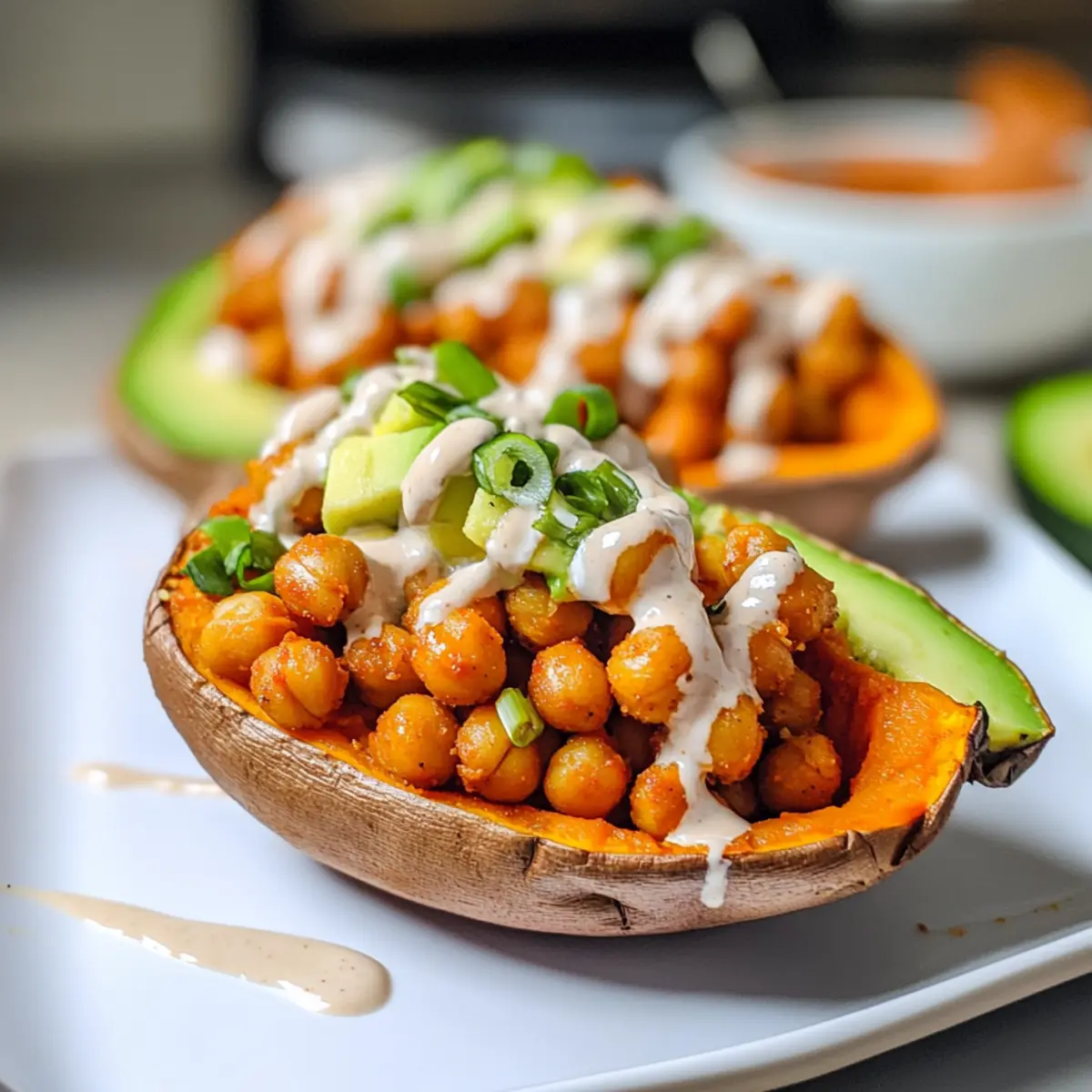 - Sobald die Süßkartoffeln fertig gebacken sind, schneide sie vorsichtig der Länge nach auf und fülle jede Süßkartoffel mit der würzigen Buffalo Kichererbse Mischung. Belege sie mit Avocado und gehackten grünen Zwiebeln.
