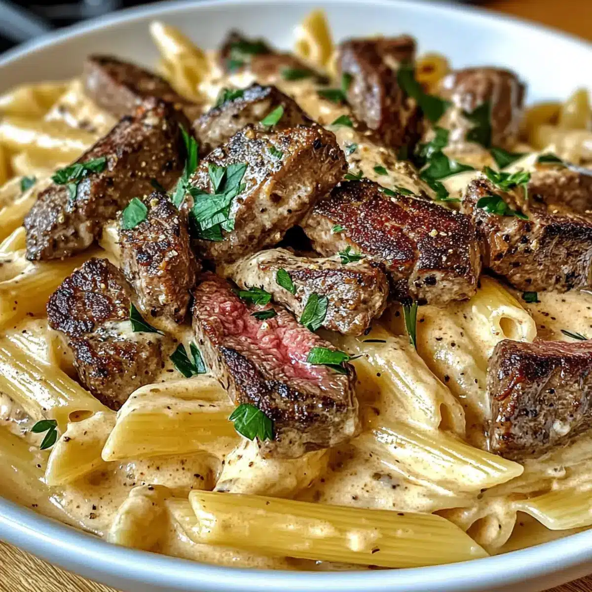- Gebe die abgetropften Penne zusammen mit den Steakstücken in die Pfanne mit der Käsesoße. Vermische alles sanft, sodass die Nudeln und das Steak gleichmäßig mit der Soße überzogen sind. Erwärme das Gericht nochmals 1-2 Minuten bei niedriger Hitze, bis alles gut durchgewärmt ist.