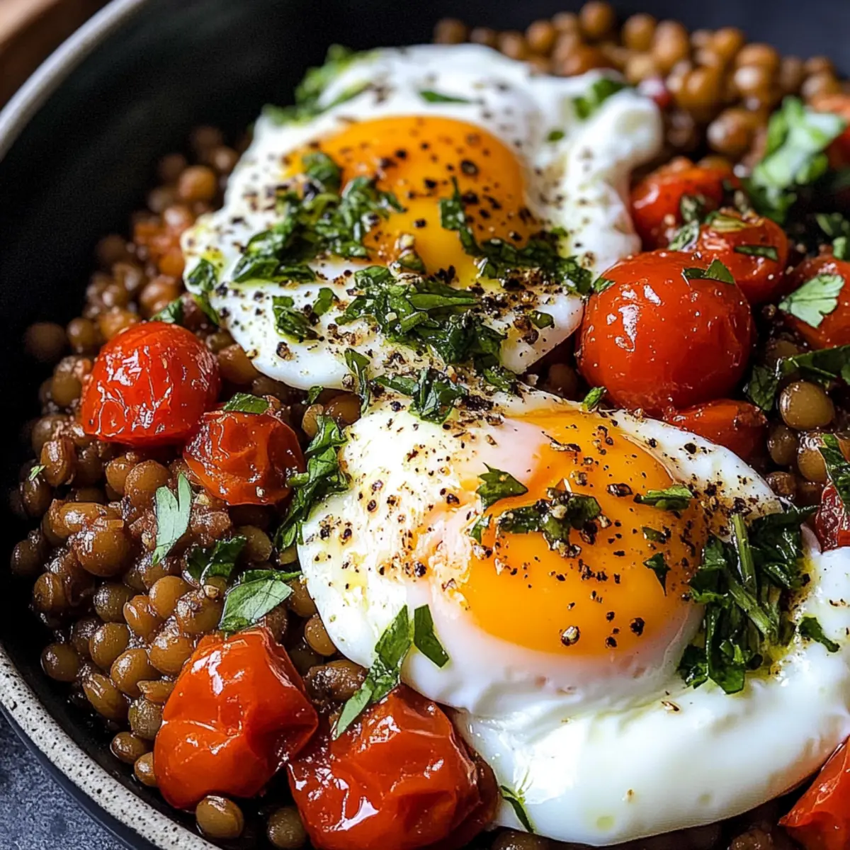 Geschmorte Linsen mit Ei und schwarzem Joghurt