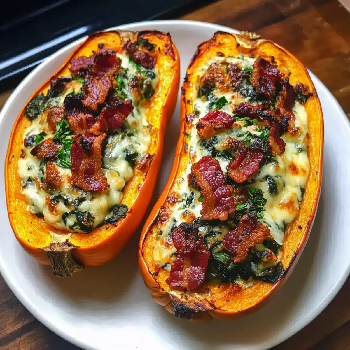 Gefüllter Butternusskürbis mit Spinat und Bacon