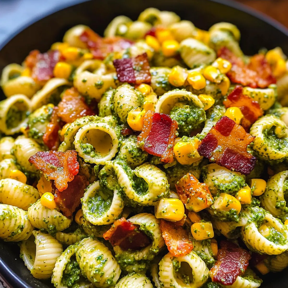 Mais-Pasta-Salat mit Speck und cremigem Pesto