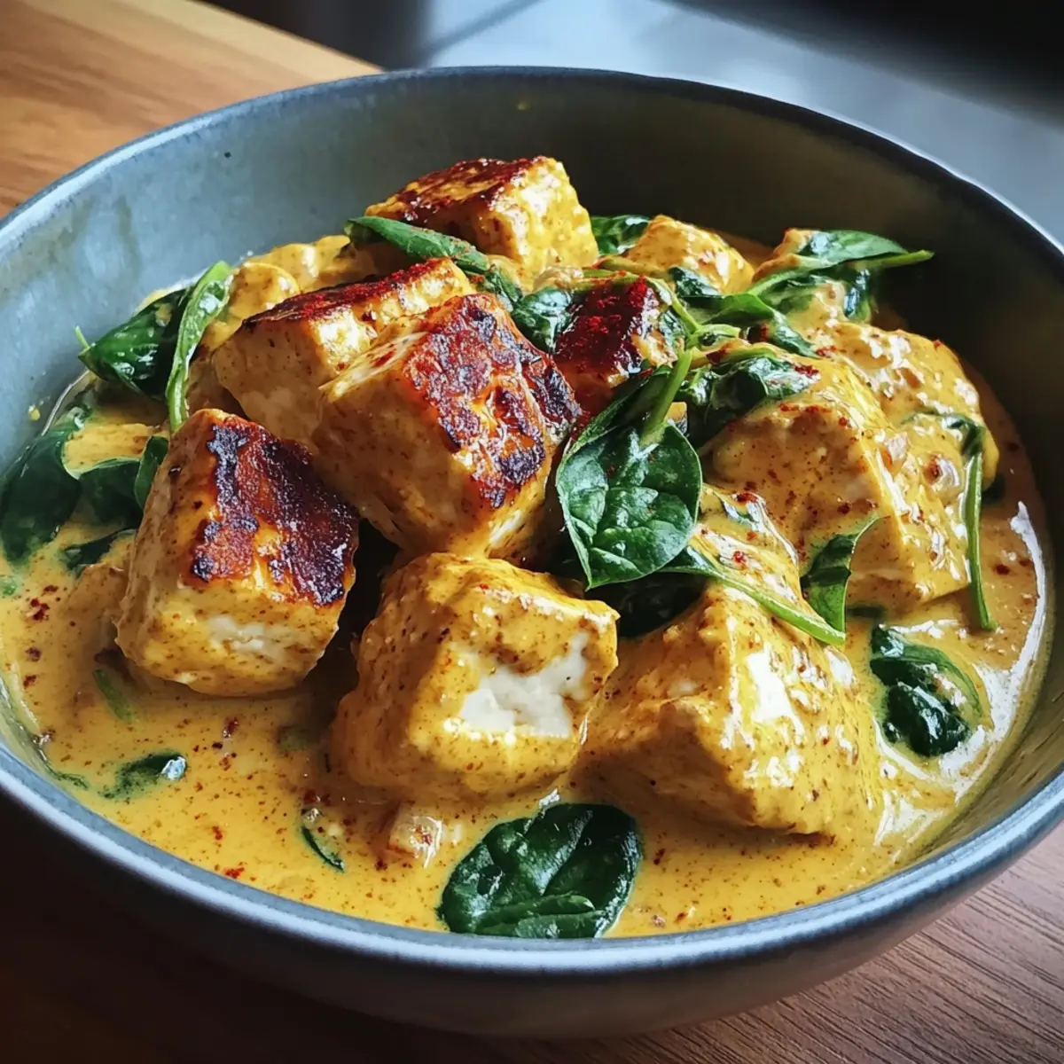 - Gib den vorbereiteten Tofu und den frischen Spinat hinzu und lasse das Ganze bei schwacher Hitze etwa 10 Minuten sanft köcheln.