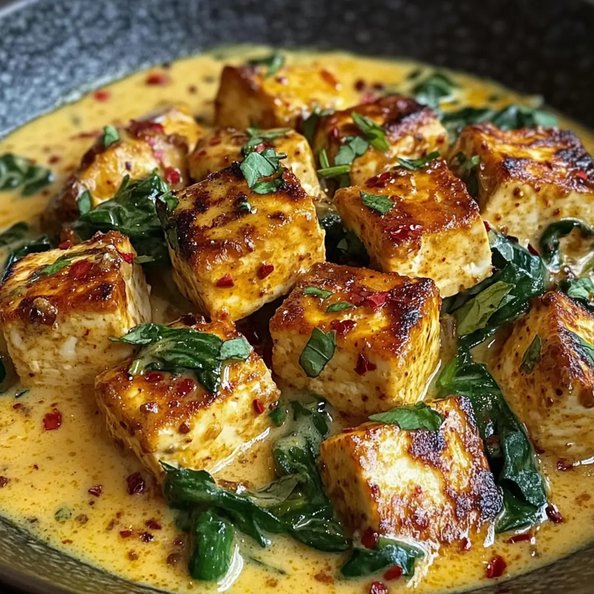 - Serviere den cremigen veganen Tofu heiß in tiefen Tellern.