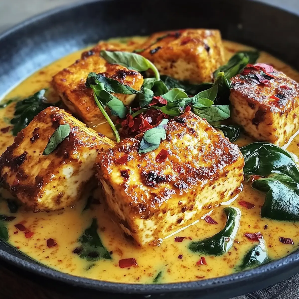 Gib den vorbereiteten Tofu vorsichtig in die Sauce und füge anschließend den frischen Spinat hinzu. Lasse das Ganze bei schwacher Hitze etwa 10 Minuten lang sanft köcheln. Dies gibt dem Tofu die Möglichkeit, die aromatische Soße aufzusaugen, während der Spinat zusammenfällt und eine leuchtende Farbe hinzufügt.