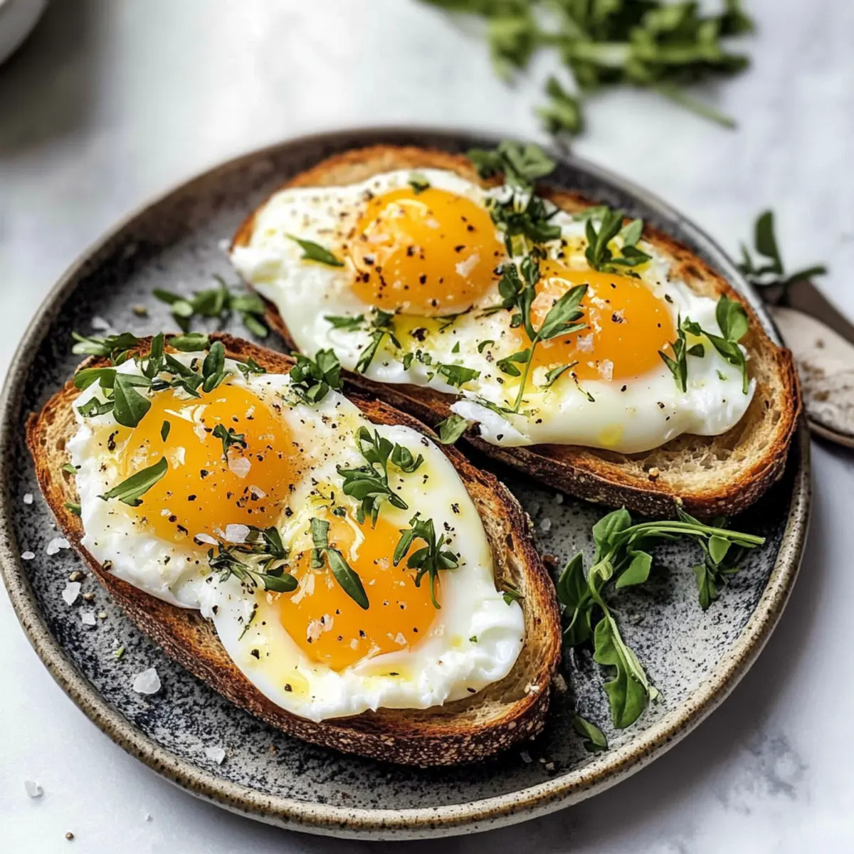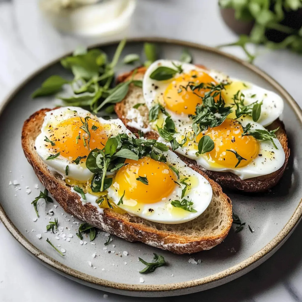 - Bestreuen Sie die Eier auf Toast mit Meersalz und Pfeffer. Fügen Sie nach Belieben frische Kräuter und andere Toppings hinzu.