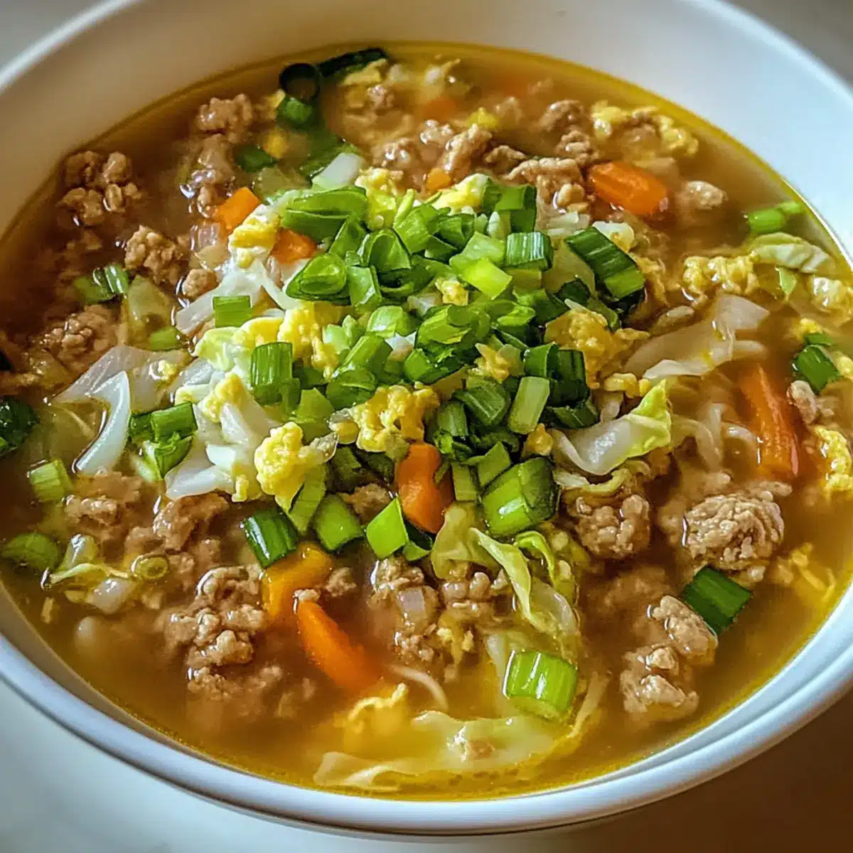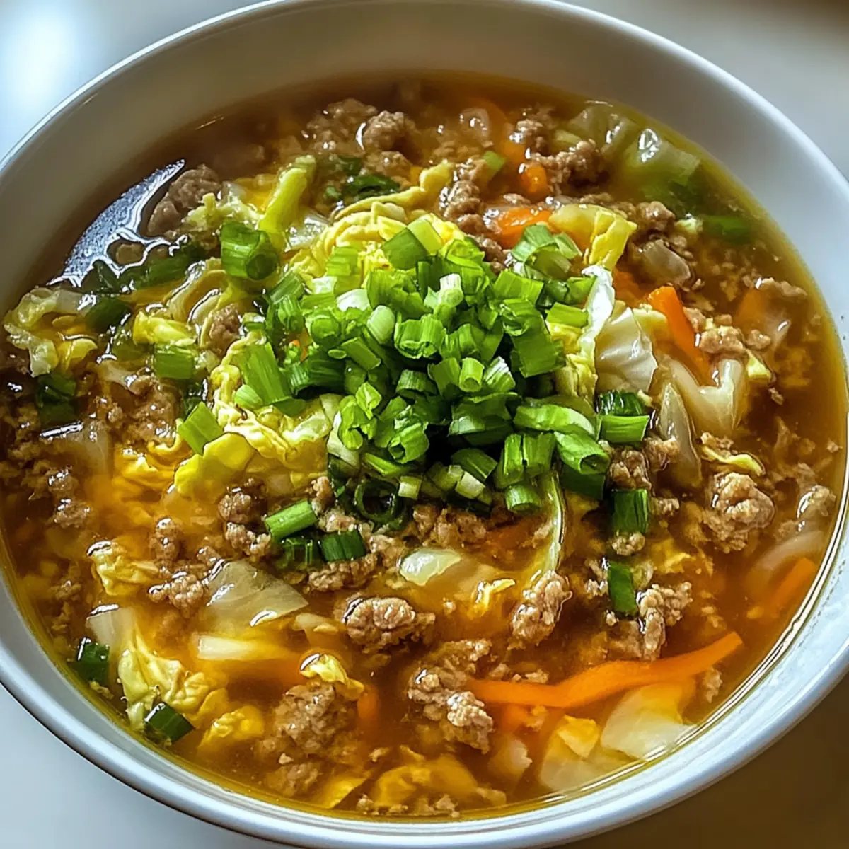Herzhaft und Befriedigend: Diese One-Pot Eierrollen Suppe vereint die besten Aromen traditioneller Eierrollen in einer schnellen, gesunden Variante.