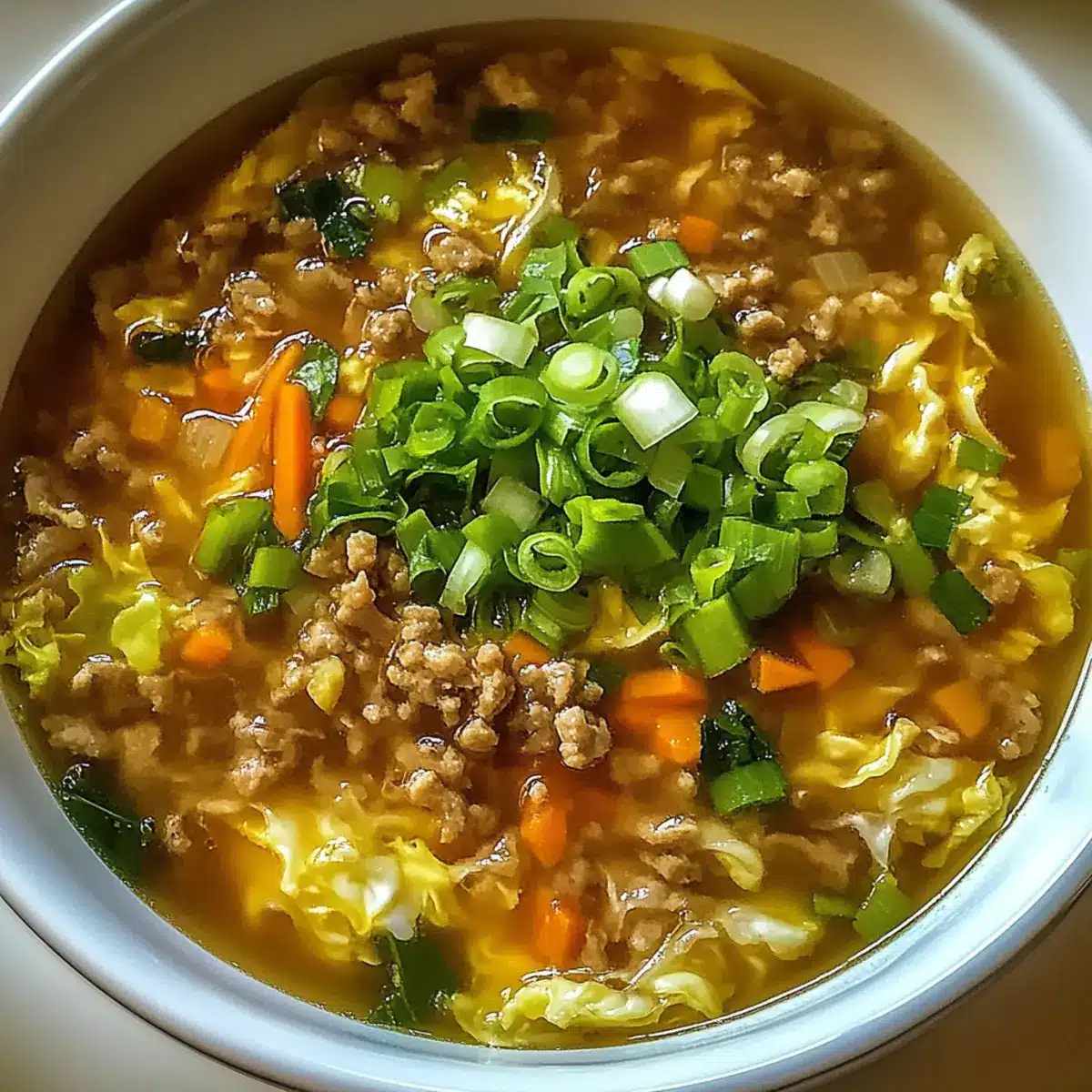 - Gemahlenes Schweinefleisch – Die Hauptproteinquelle, die der Suppe ihre Reichhaltigkeit verleiht. Du kannst es auch durch Hähnchen- oder Putenhack ersetzen, um eine leichtere Variante zu genießen.