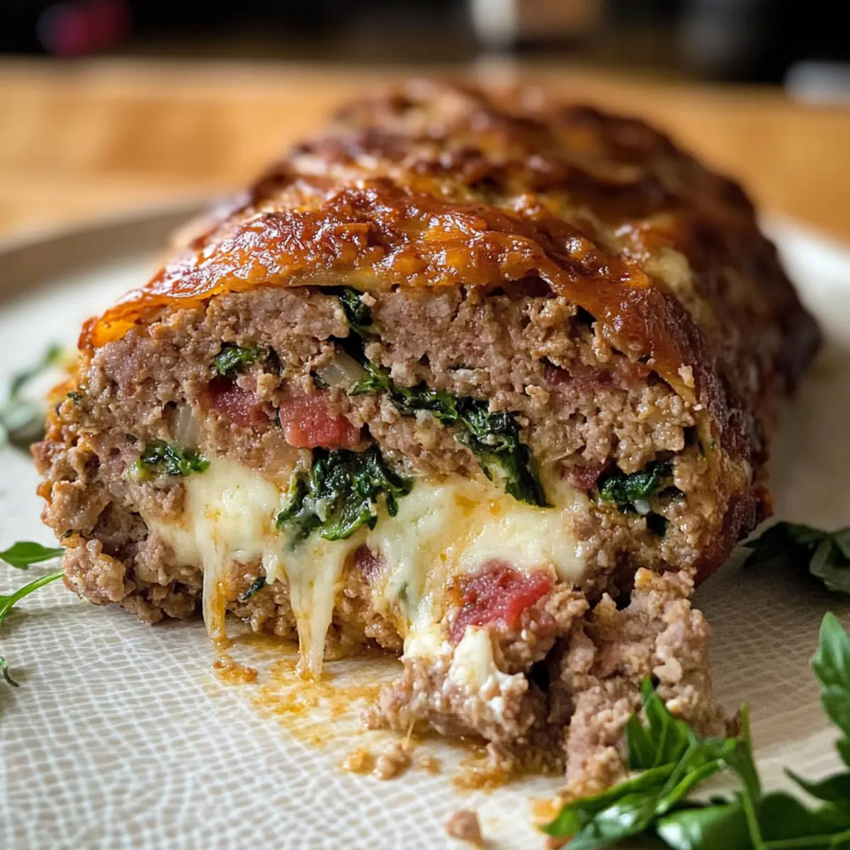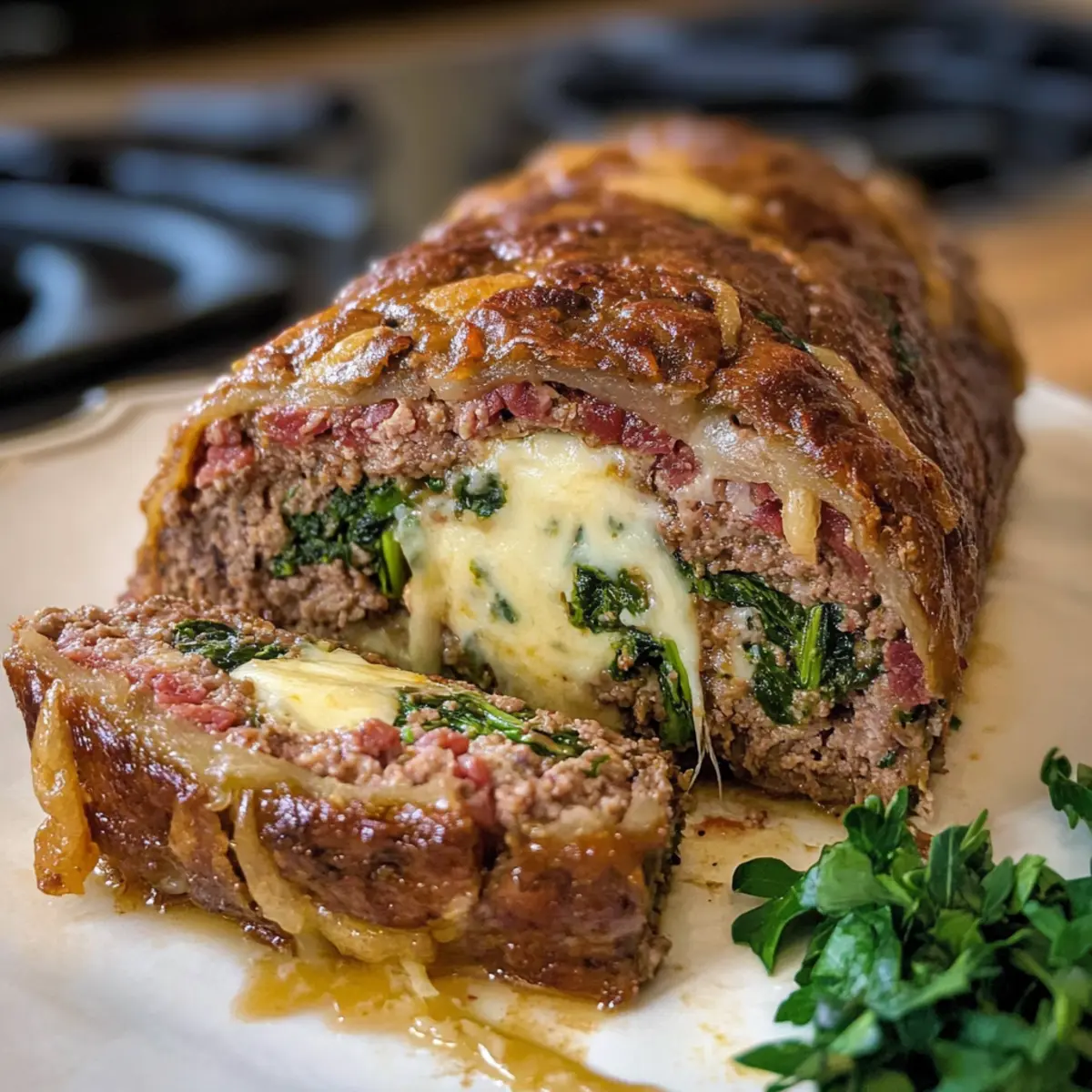 Auf der Fleischmasse schichtest du den frischen Spinat, den Prosciutto und den Provolone-Käse gleichmäßig. Lass dabei einen kleinen Rand frei, damit die Füllung beim Rollen nicht herausquillt. Diese aromatische Füllung sorgt für den herzhaften Geschmack deines Fleischklops-Braciole.