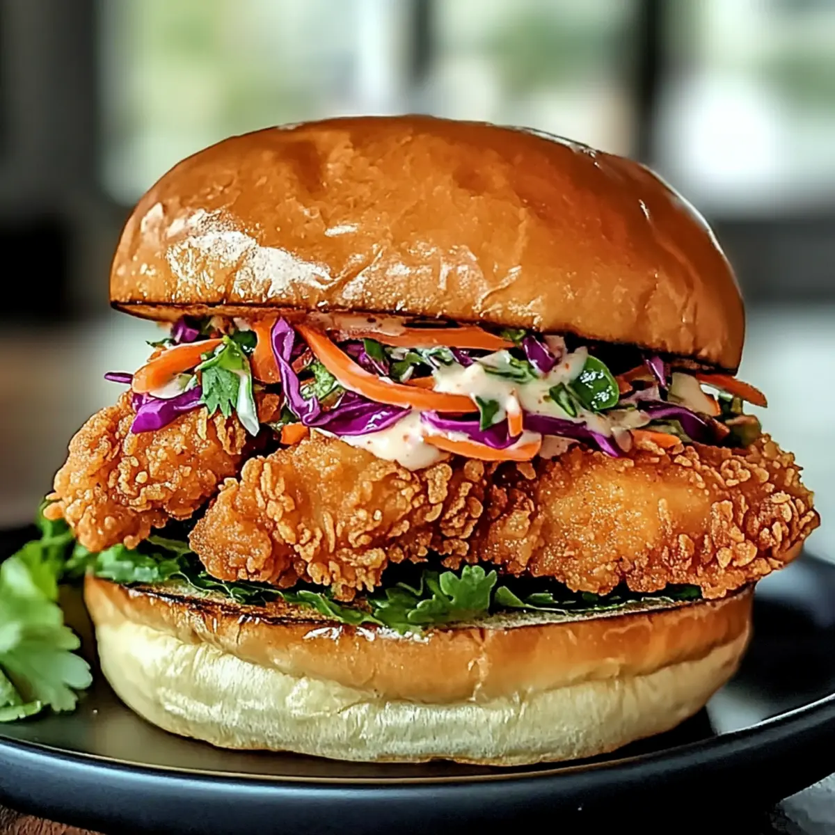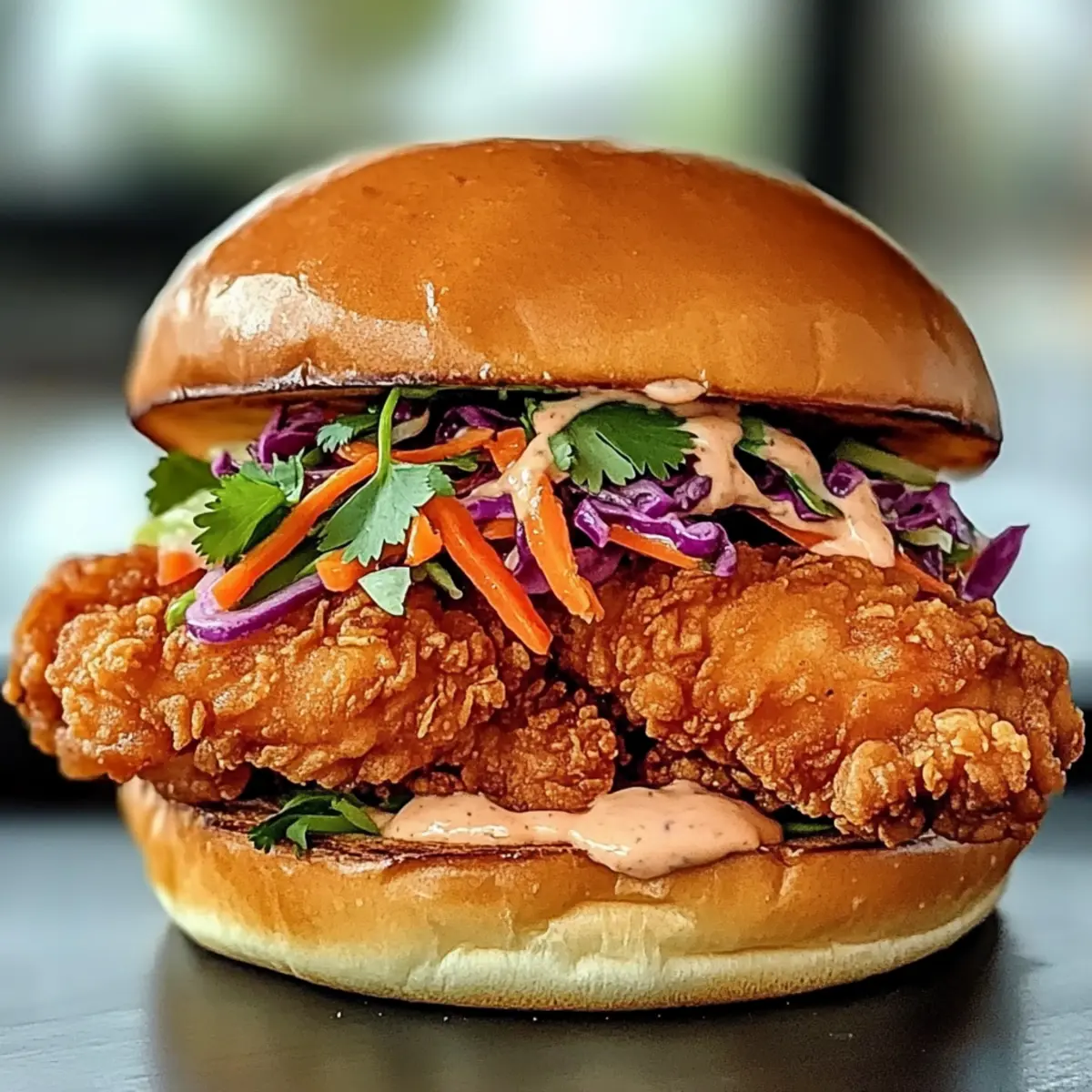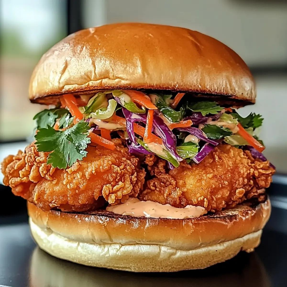- Sandwich zusammenstellen: Röste die Briochebrötchen. Verbreite eine Menge der würzigen Mayo auf der Unterseite jedes Brötchens. Schichte das frittierte Hähnchen, Slaw, Koriander und optional Gurken darauf.