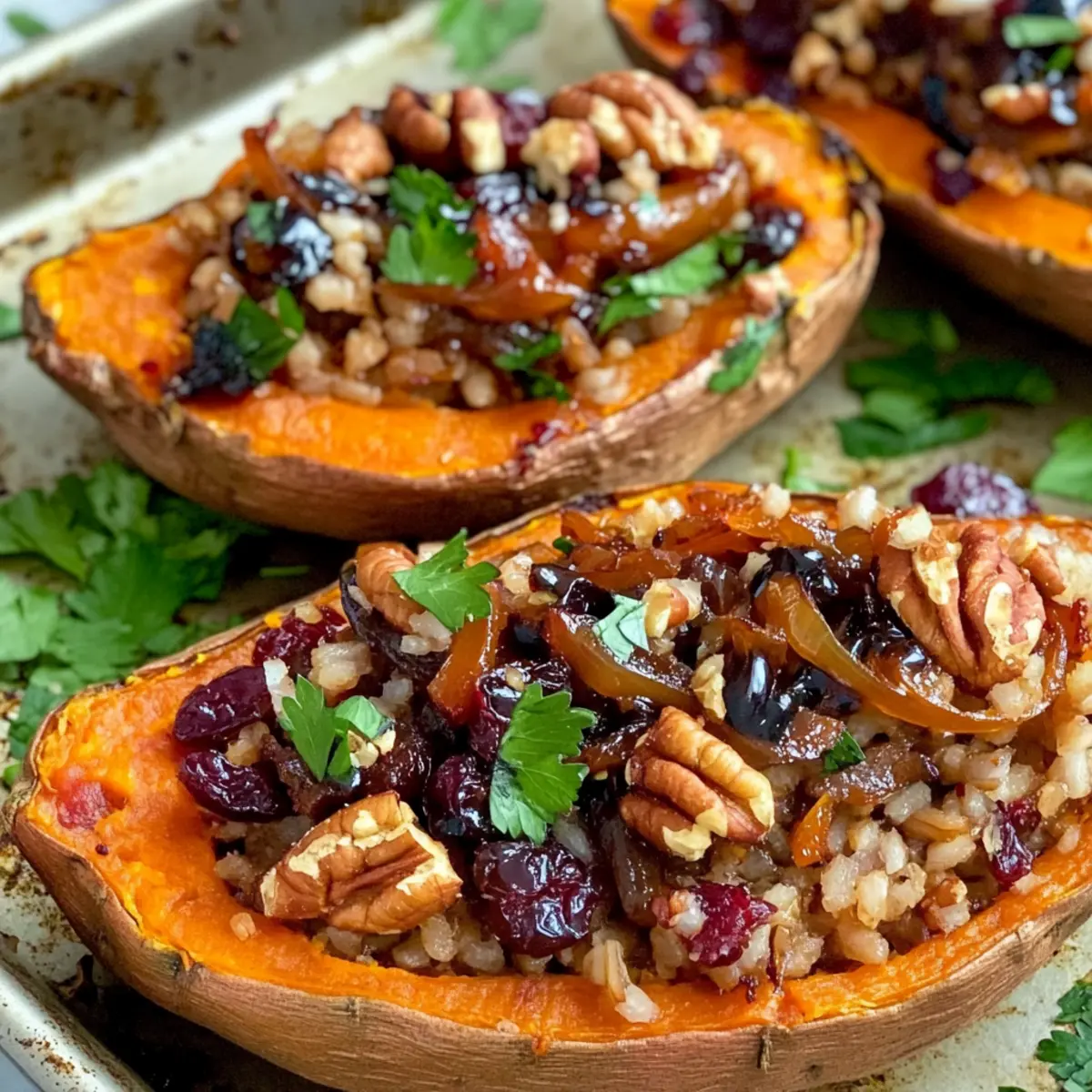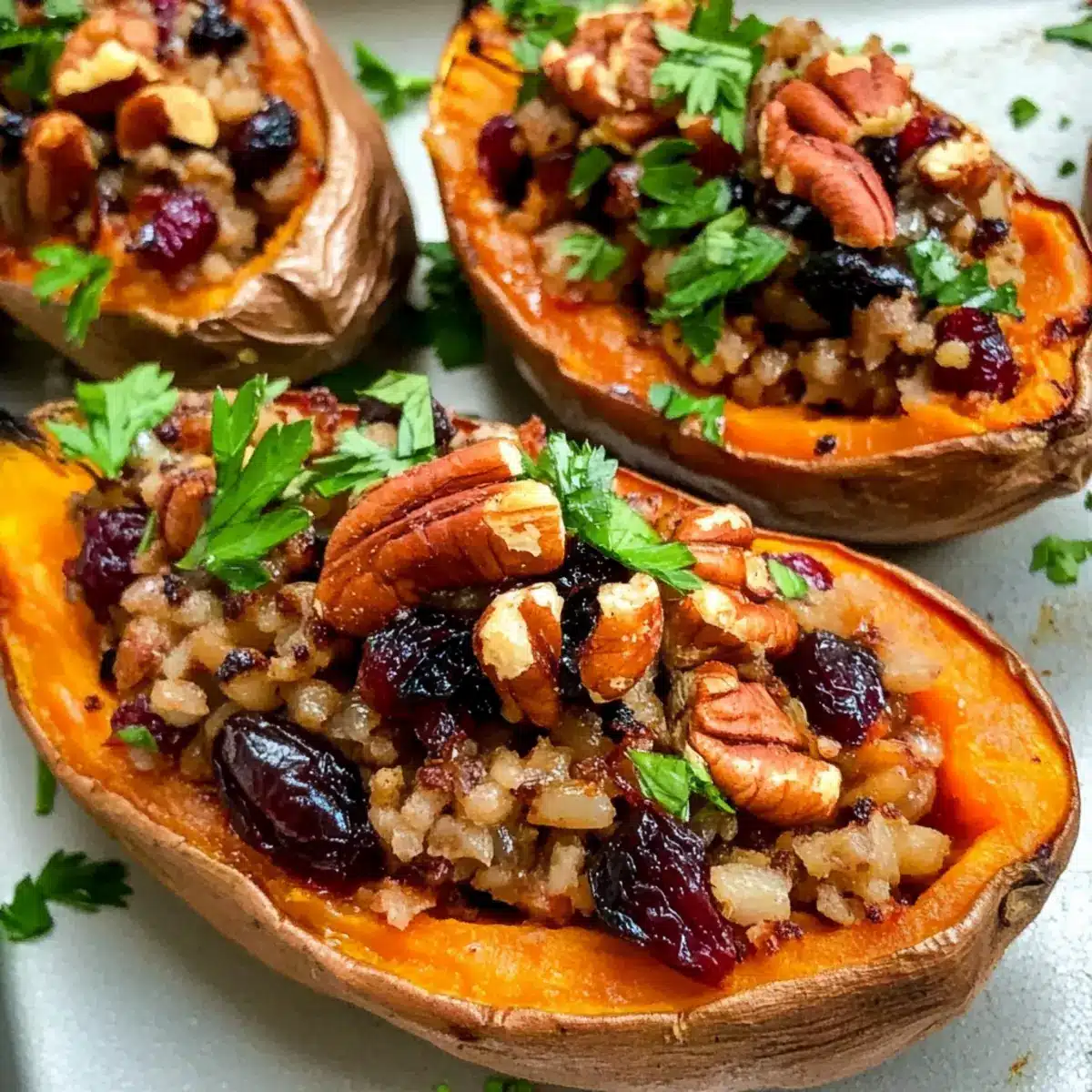 Es ist erstaunlich, wie ein einfaches Gemüse eine wahre Geschmacksreise auslösen kann. Die gebackenen Süßkartoffeln, die ich heute mit euch teile, sind nicht nur optisch ansprechend, sondern stecken auch voller köstlicher Aromen. Diese herzhaften, zweimal gebackenen Süßkartoffeln sind perfekt für jeden Anlass – sei es ein gemütliches Abendessen oder das festliche Thanksgiving-Buffet. Mit einer Füllung aus karamellisierten Zwiebeln, nahrhaftem braunen Reis, fruchtigen Cranberries und knackigen Nüssen sind sie zudem vegan und glutenfrei! Besonders praktisch ist, dass sie sich wunderbar im Voraus zubereiten lassen, sodass ihr in der Küche weniger Zeit verbringen müsst und mehr Zeit mit euren Lieben genießen könnt. Neugierig, wie einfach es ist, diesen Gaumenschmaus zuzubereiten? Lasst uns loslegen!