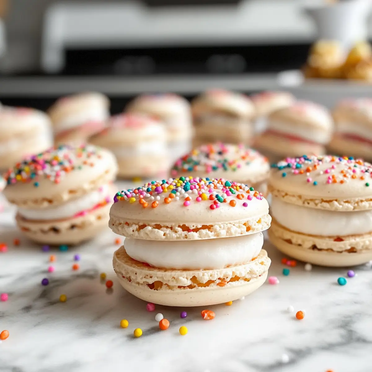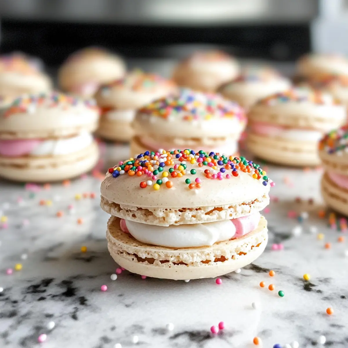 Kreativer Spaß: Überrasche deine Gäste mit bunten Nonpareils und einem Hauch von Farbe, das diese Macarons zu einem visuellen Highlight macht—ideal für Feiern oder einfach als süße Snack-Idee.