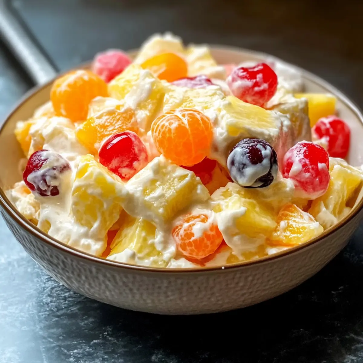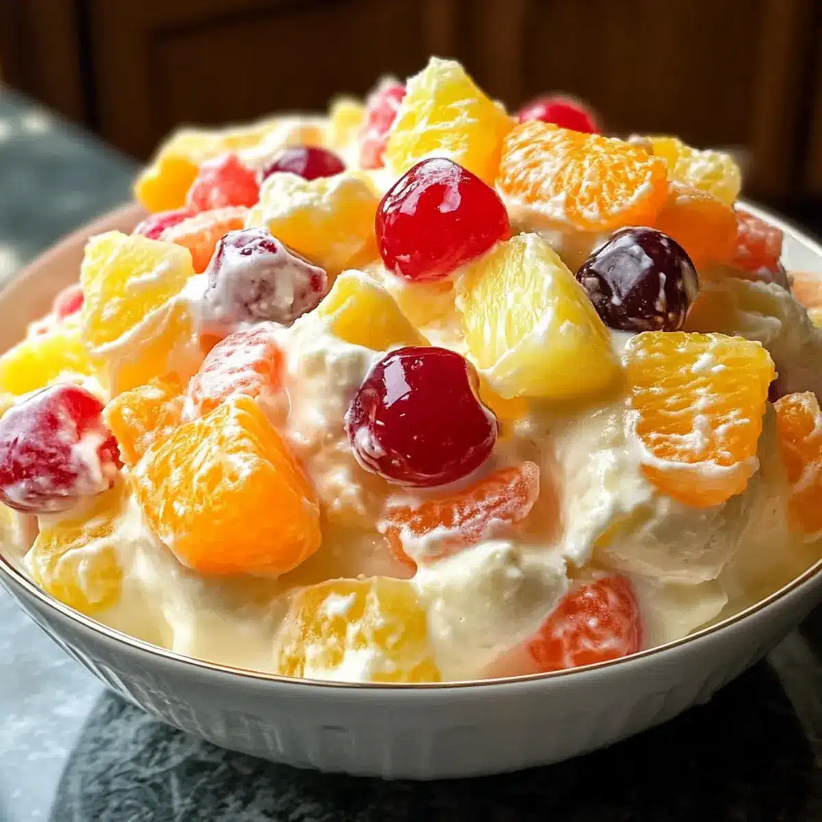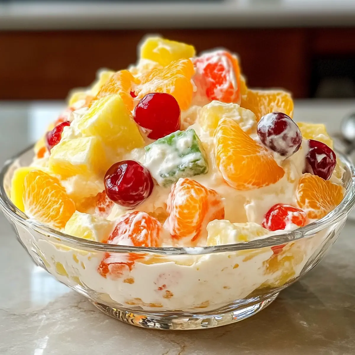 - Zerstoßene Ananas und die abgetropften Mandarinen hinzufügen. Sanft vermischen, ohne die Luftigkeit zu verlieren. Optional Maraschino-Kirschen und gehackte Nüsse hinzufügen.
