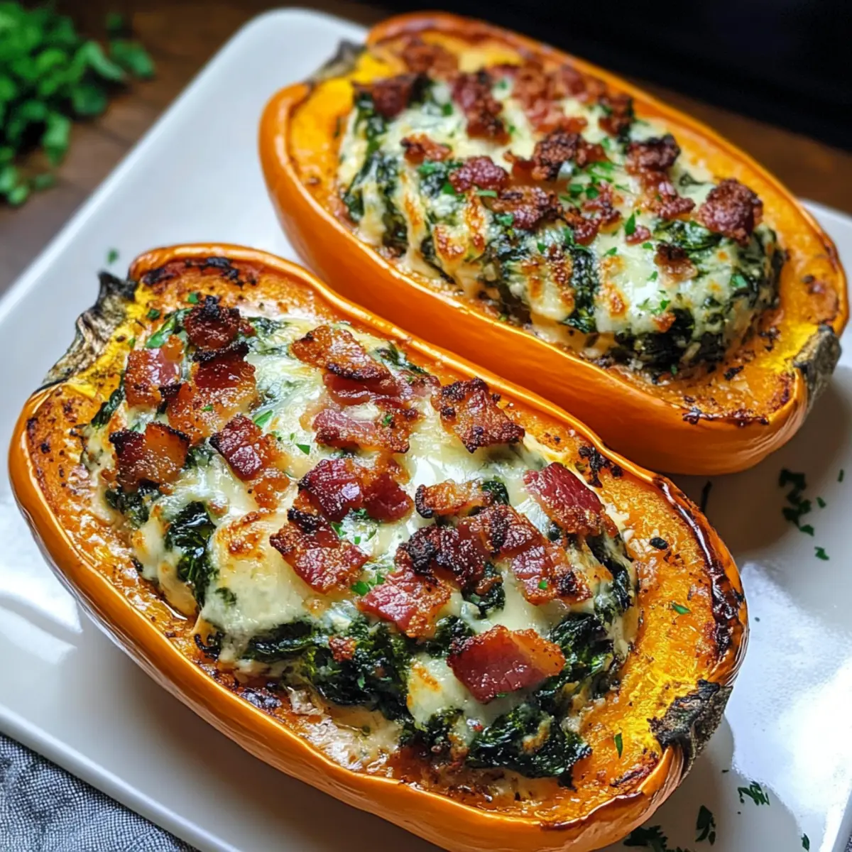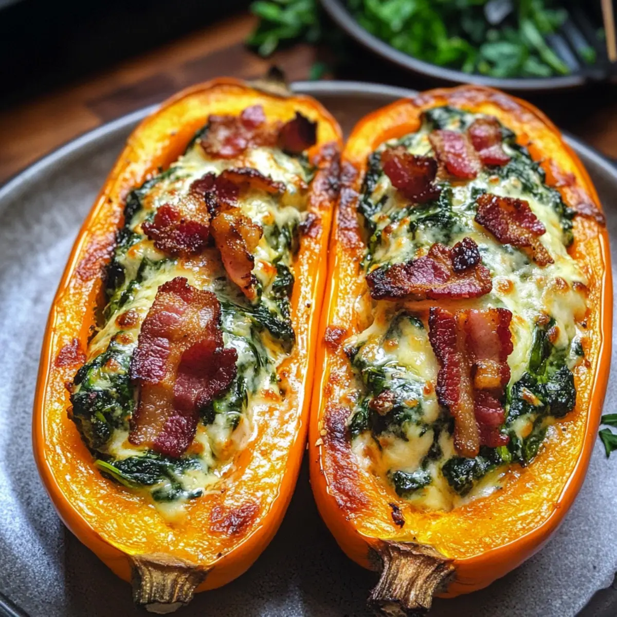 Gefüllter Butternusskürbis mit Spinat und Bacon