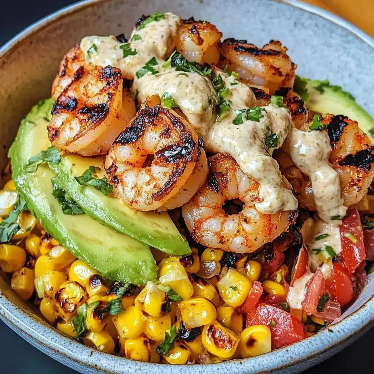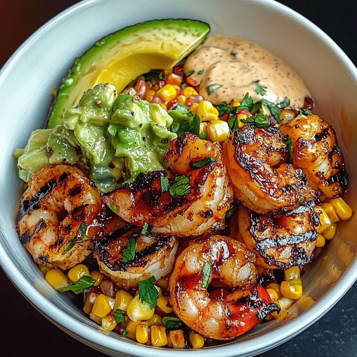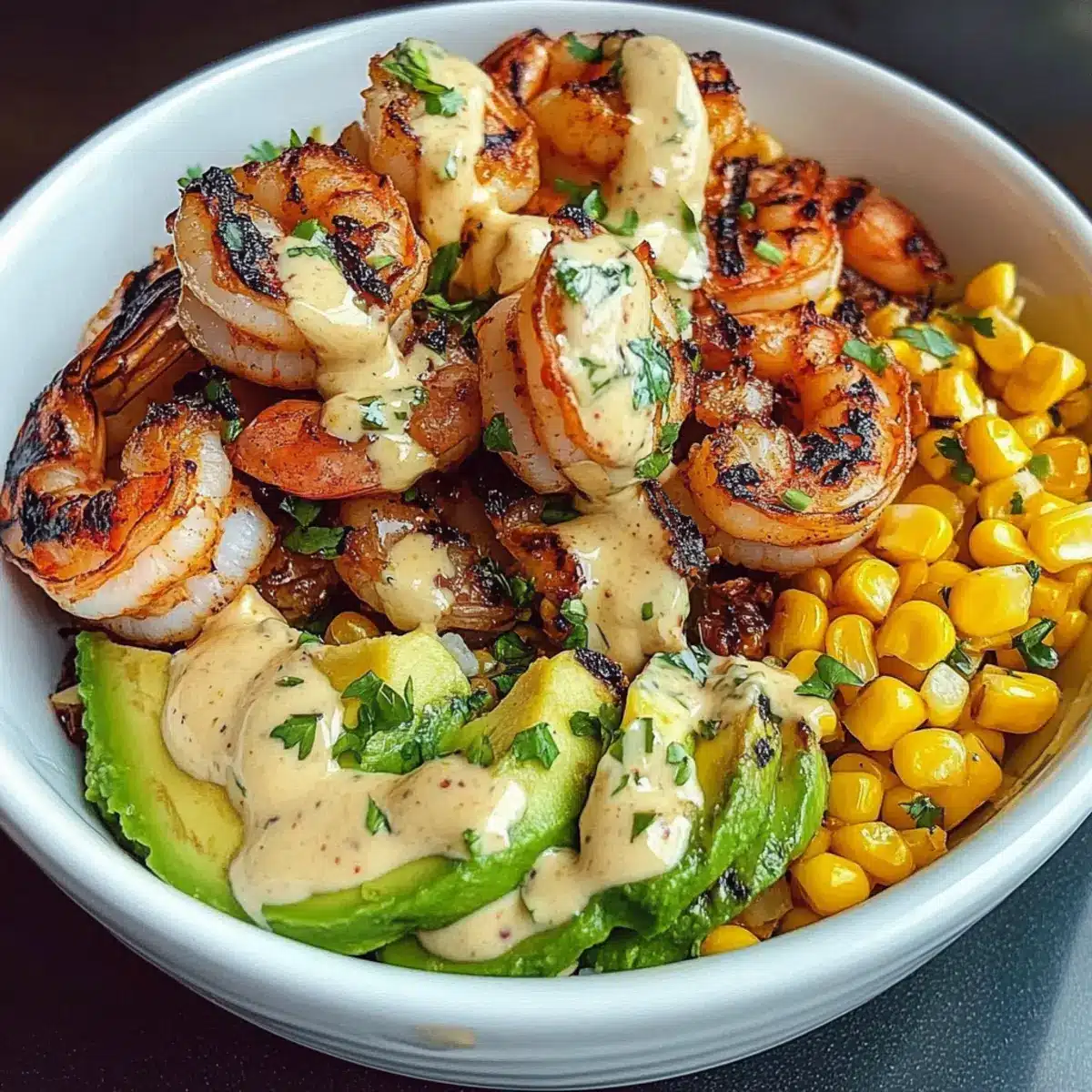 - Schüsseln zusammenstellen: In Schalen die Mais-Salsa gleichmäßig auf dem Boden verteilen. Gegrillte Garnelen und Avocadoscheiben hinzufügen. Die cremige Knoblauchsauce darüberträufeln und mit Sesamsamen und Frühlingszwiebeln garnieren.