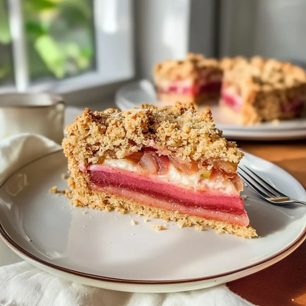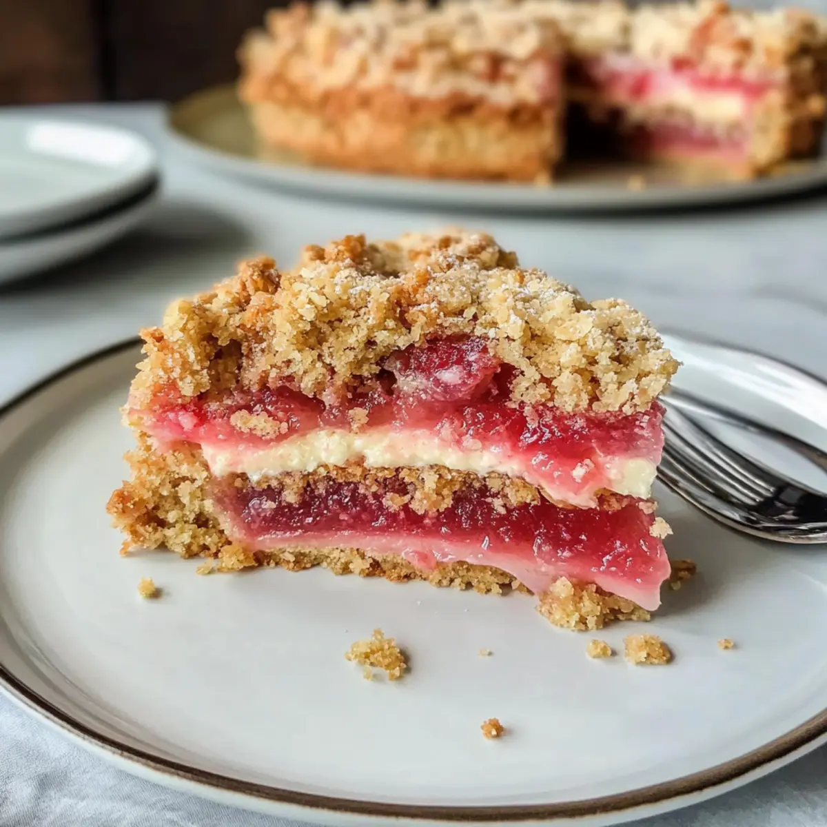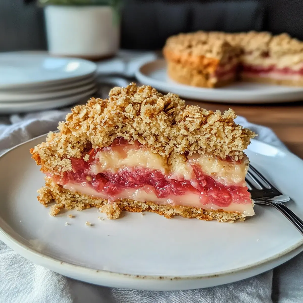 Perfekte Konsistenz: Der knusprige Haferboden bildet einen bezaubernden Kontrast zur cremigen Rhabarberfüllung.