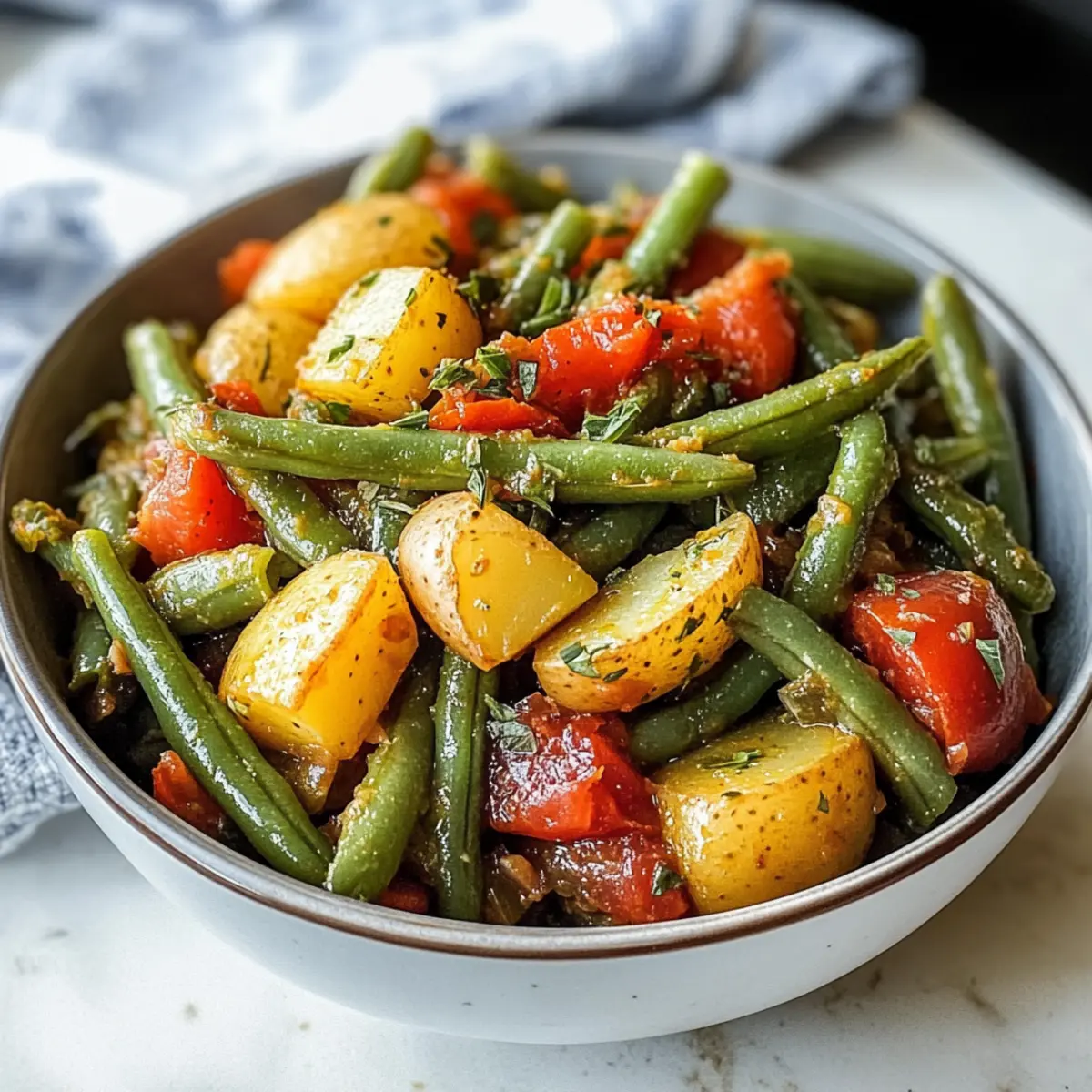 Die grüne Bohnen Fasolakia ist ideal für Meal Prep und spart wertvolle Zeit in der Küche! Sie können die grünen Bohnen, Babykartoffeln und die Tomaten bis zu 24 Stunden im Voraus vorbereiten, indem Sie sie waschen, schneiden und in luftdichten Behältern im Kühlschrank aufbewahren. Dies sorgt dafür, dass die frischen Zutaten ihre Aromen und Nährstoffe bewahren. Wenn es Zeit zum Kochen ist, erhitzen Sie einfach etwas Olivenöl, braten die Zwiebel an und fügen die vorbereiteten Zutaten hinzu. Die Aromen intensivieren sich, und das Gericht schmeckt am nächsten Tag sogar noch besser. Meistern Sie diese einfache Zubereitung, um im Alltag Zeit zu sparen und dennoch gesunde, köstliche Mahlzeiten zu genießen!