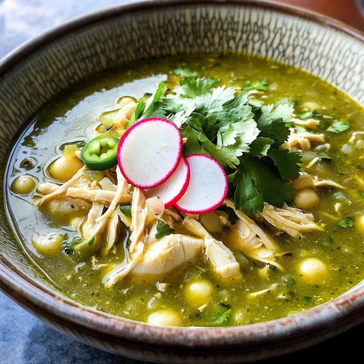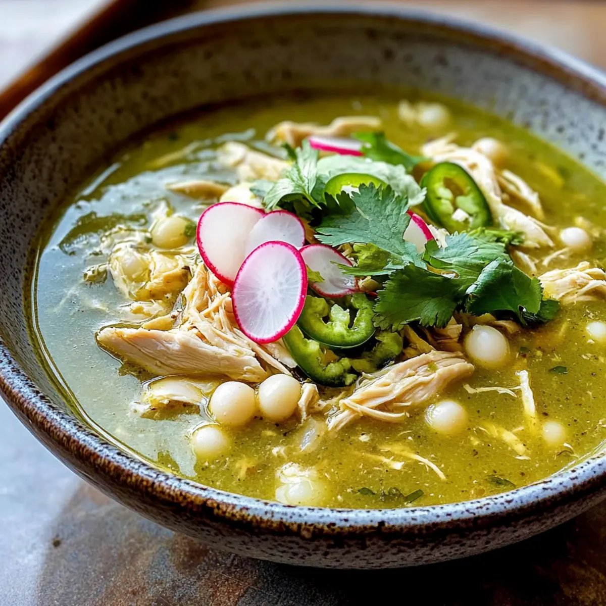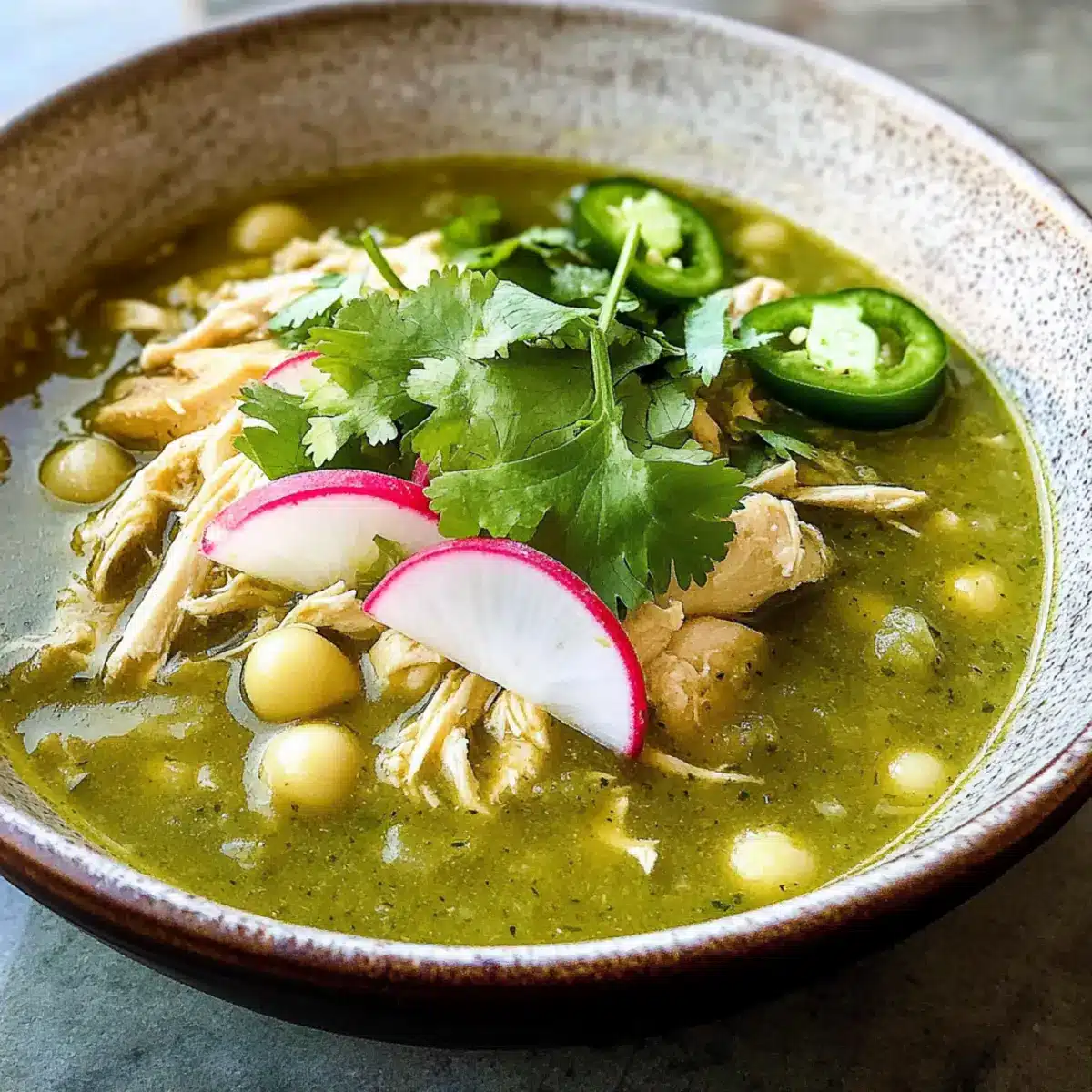 Voller Geschmack: Diese köstliche Brühe vereint die Aromen frischer Tomatillos, würziger Jalapeños und zartem Hühnchen für ein Geschmackserlebnis, das Erinnerungen weckt.