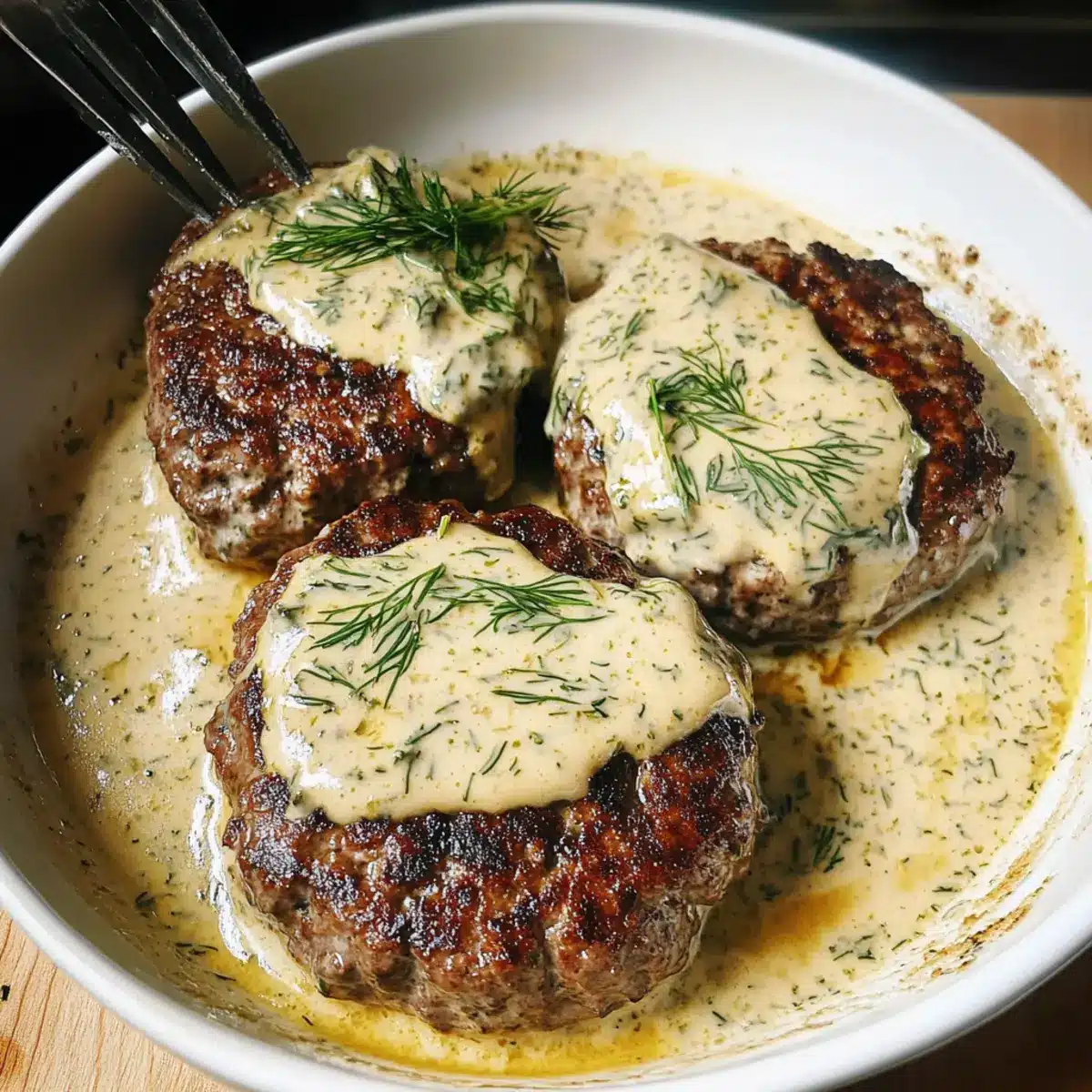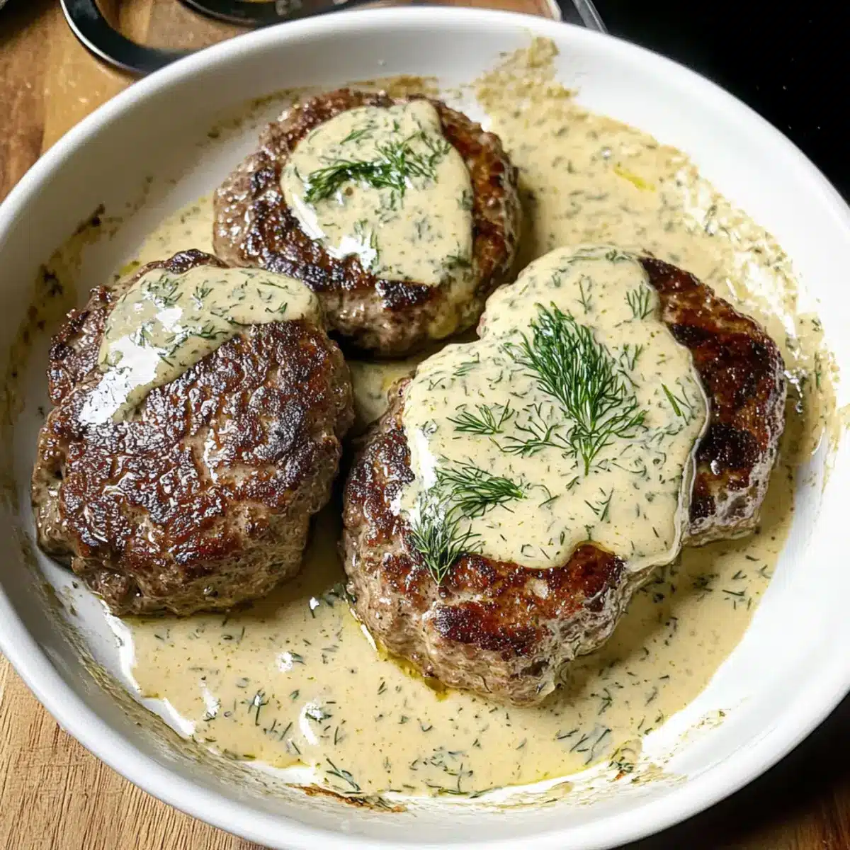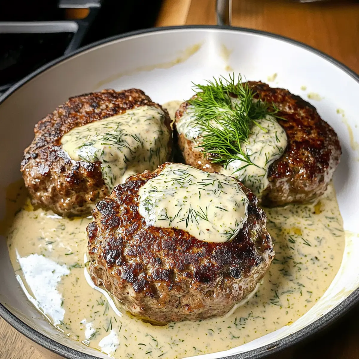 Saftige Hamburger-Steaks mit cremiger Dillsoße