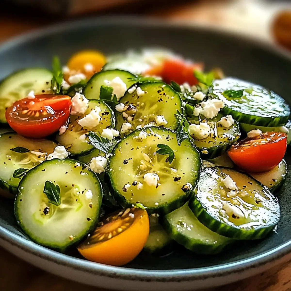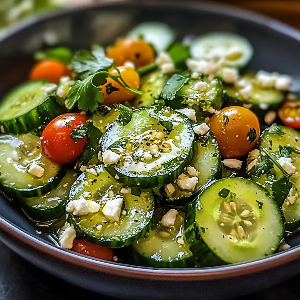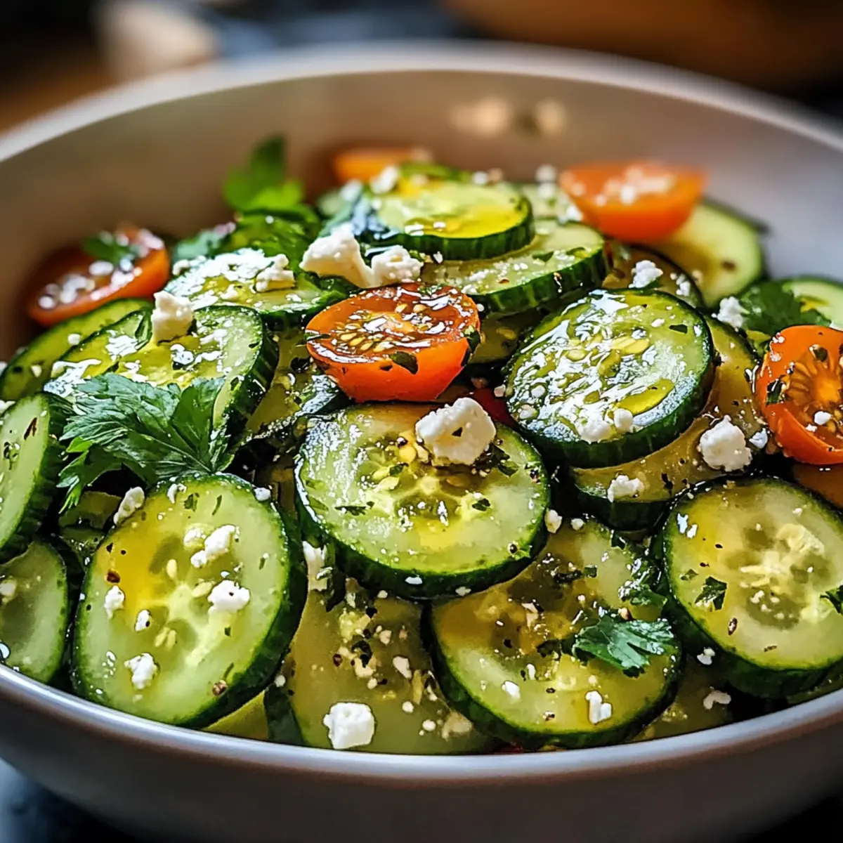 Prevent Sogginess: Füge das Dressing erst kurz vor dem Servieren hinzu, um ein Soggen der Gurken zu vermeiden. So bleibt der Salat knackig.