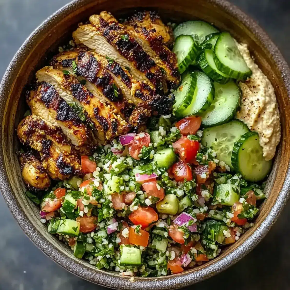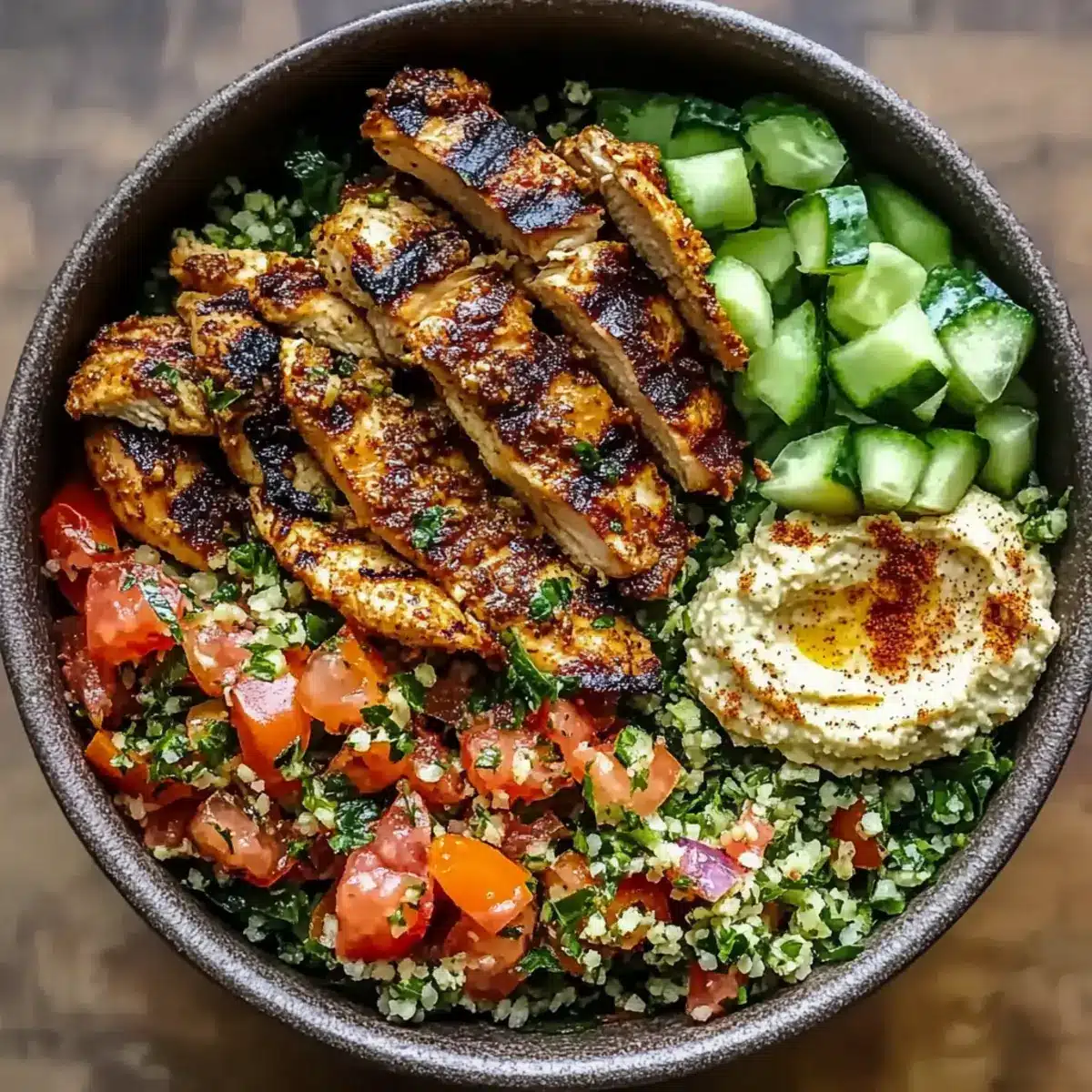- Schüssel anrichten: Tabbouleh als Basis, dann Hähnchen, Hummus, Gurkenscheiben und eingelegte Rüben hinzufügen.