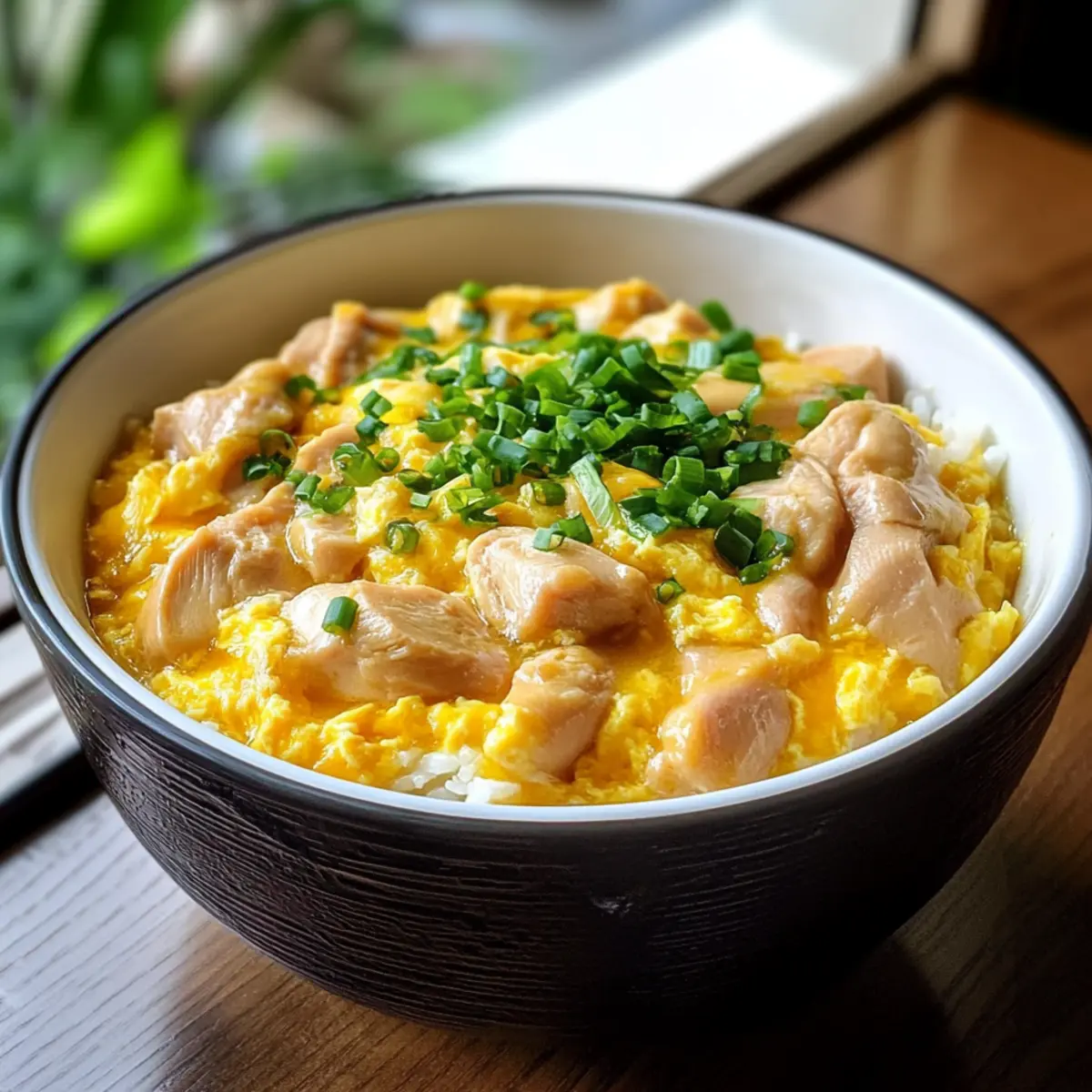 Verteile den Hühnchen und Ei Reis gleichmäßig über Schalen mit warmem, gekochtem Reis. Garnieren nach Belieben mit Frühlingszwiebeln, einem Spritzer Sesamöl oder getrocknetem Nori. Serviere das fertige Oyakodon sofort für das beste Geschmackserlebnis.