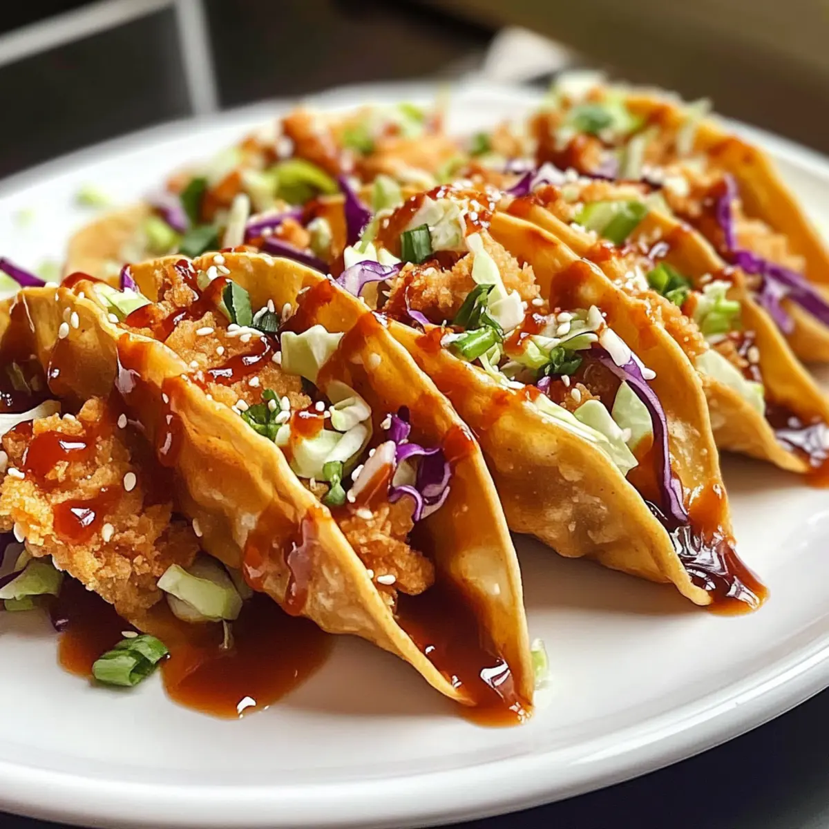 Diese Hühnchen-Teigtaschen sind eine fantastische Option für alle, die Zeit im Voraus sparen möchten! Sie können das Hühnchen bis zu 24 Stunden im Voraus marinieren, indem Sie es einfach in Teriyaki-Sauce, Sojasauce, Knoblauch und Ingwer einlegen. Das vorbereitete Coleslaw lässt sich ebenfalls im Voraus zubereiten und bleibt bis zu 3 Tage frisch im Kühlschrank. Achten Sie darauf, die Wonton-Wrapper erst kurz vor dem Servieren zu frittieren, um ihre Knusprigkeit zu bewahren. Wenn Sie die Tacos zusammenstellen, füllen Sie sie erst kurz vor dem Servieren, damit sie frisch und knackig bleiben – so gewährleisten Sie, dass der Geschmack und die Textur genau so köstlich sind wie am ersten Tag!