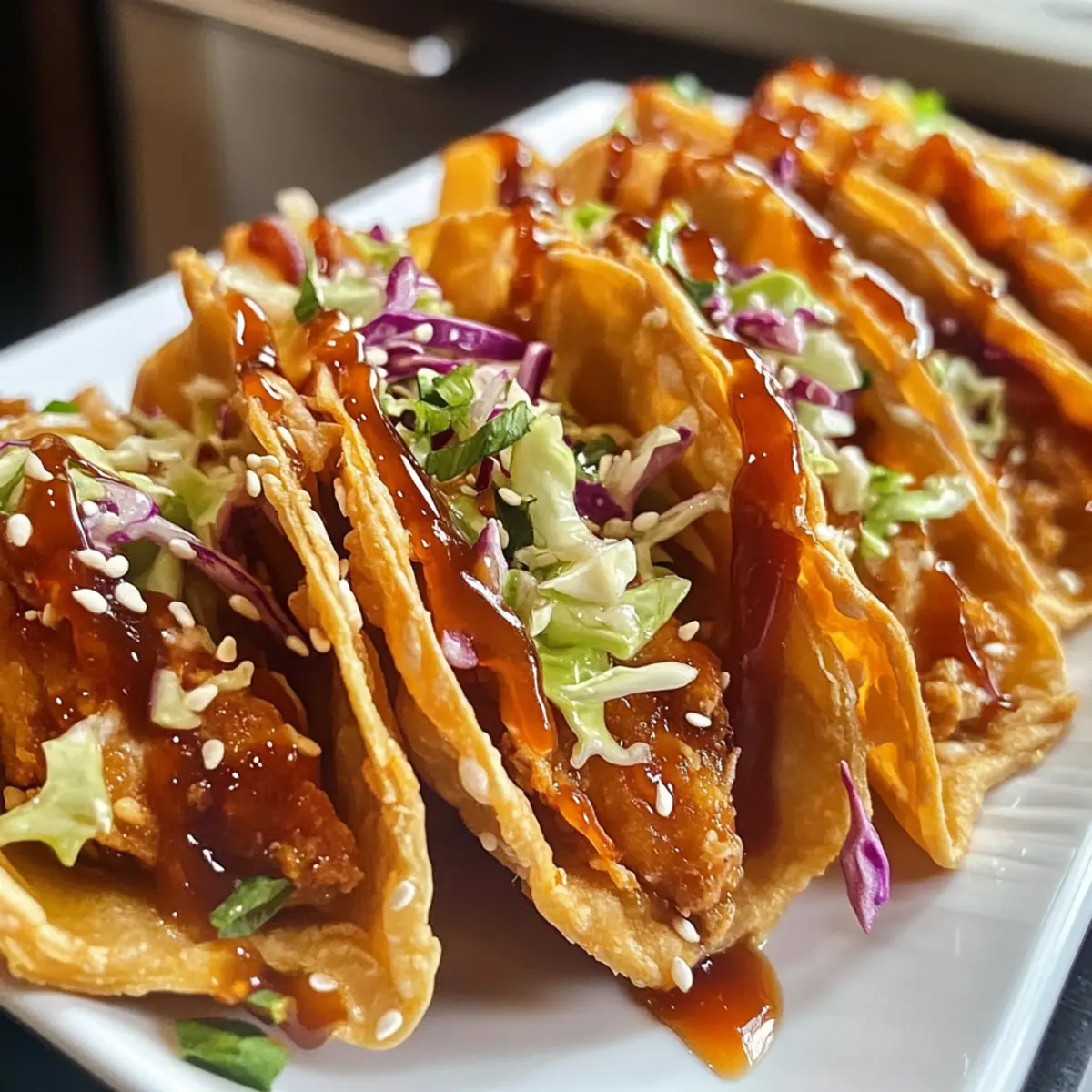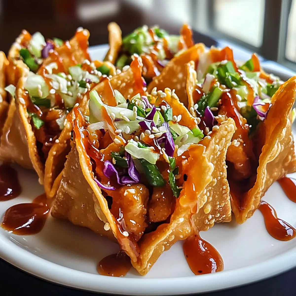 Einzigartige Kombination: Diese Hühnchen-Teigtaschen vereinen knusprige Wontons mit saftigem Teriyaki-Hühnchen und frischem Coleslaw für ein Geschmackserlebnis, das begeistert.