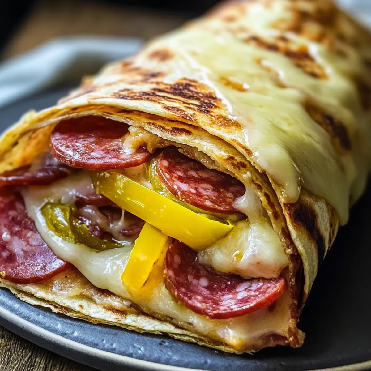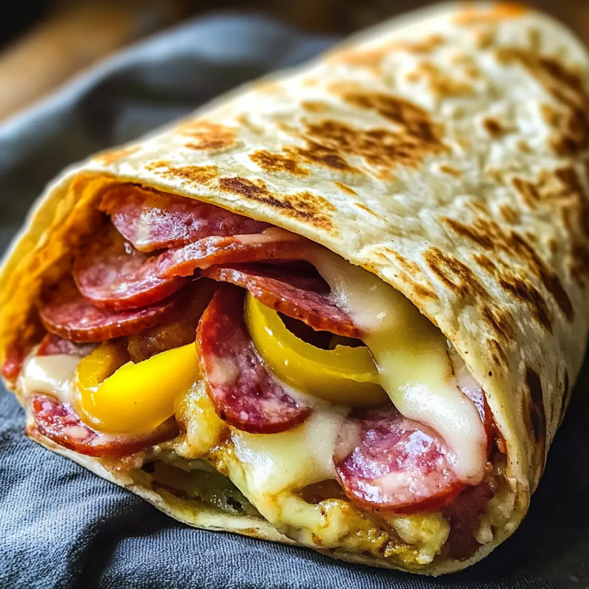 Belege eine Hälfte der Tortilla großzügig mit einer Schicht Provolone, gefolgt von Salami, Peperoni und Bananenpeper. Diese Kombination sorgt für den klassischen Geschmack eines italienischen Subs. Versuche, die Zutaten gleichmäßig zu verteilen, um sicherzustellen, dass jede Bissen harmonisch schmeckt.