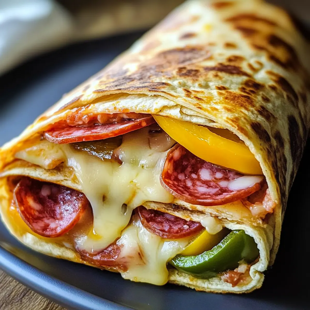- Belege eine Hälfte der Tortilla mit Provolone, gefolgt von Salami, Peperoni und Bananenpeper.