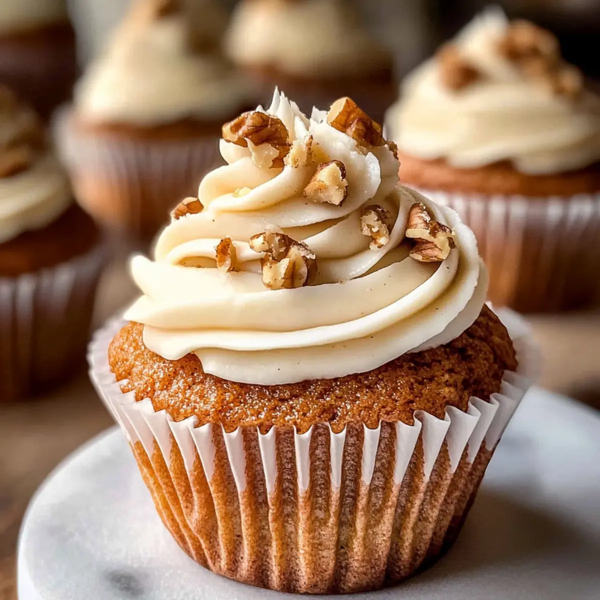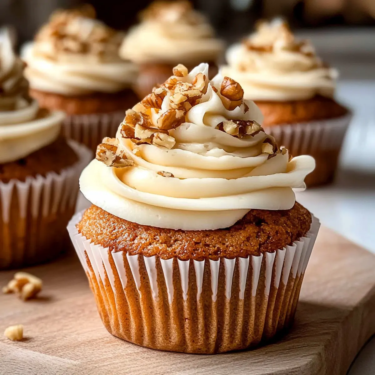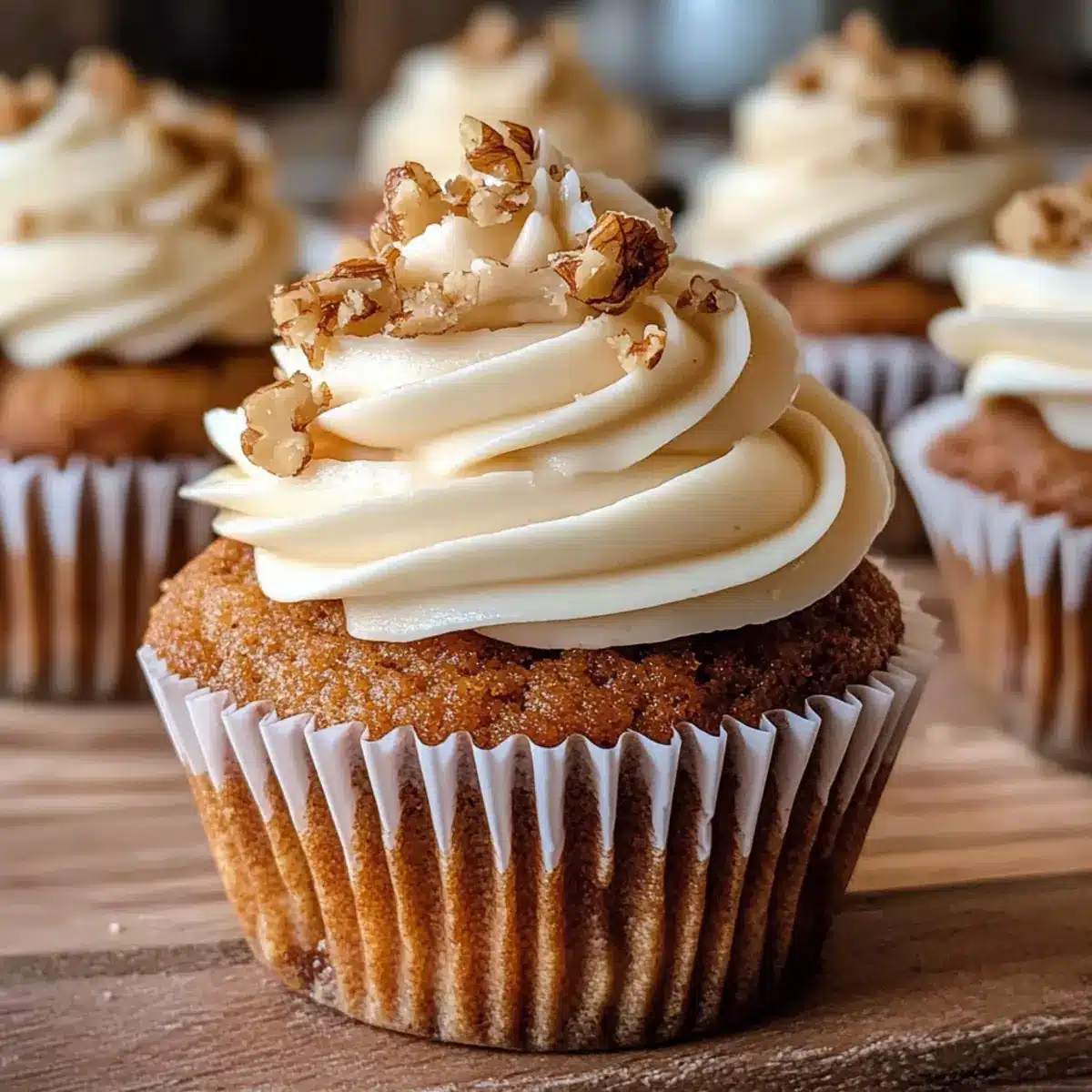 Wenn die Cupcakes vollständig abgekühlt sind, verwenden Sie einen Spritzbeutel oder einen Löffel, um das Frosting auf jeden Cupcake zu spritzen. Garnieren Sie die Cupcakes nach Belieben mit gehackten Walnüssen für einen zusätzlichen Crunch. Diese einfache Dekoration macht Ihre Karottenkuchen Cupcakes noch einladender und verführerischer.