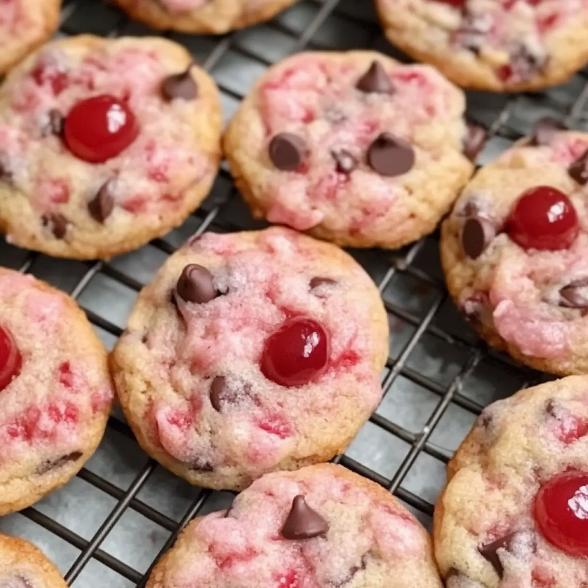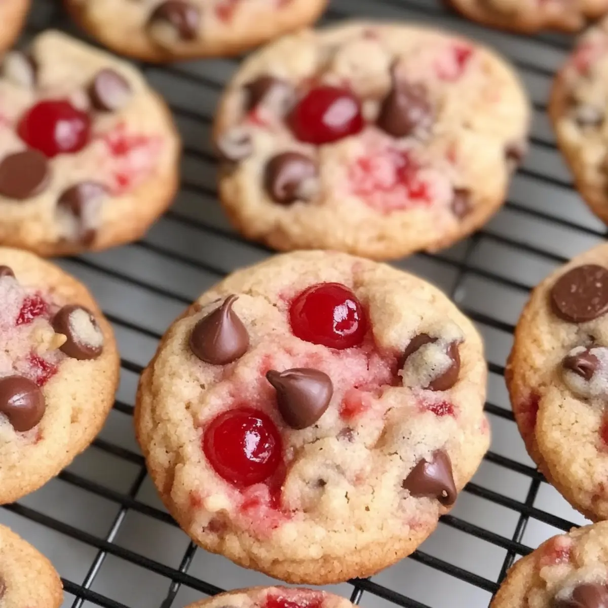 Backen Sie die Kirsche Schokoladenstückchen im vorgeheizten Ofen für 12-13 Minuten, bis die Ränder leicht goldbraun sind. Die Mitte wird noch etwas weich erscheinen; das ist normal, da die Kekse beim Abkühlen weiter fest werden.