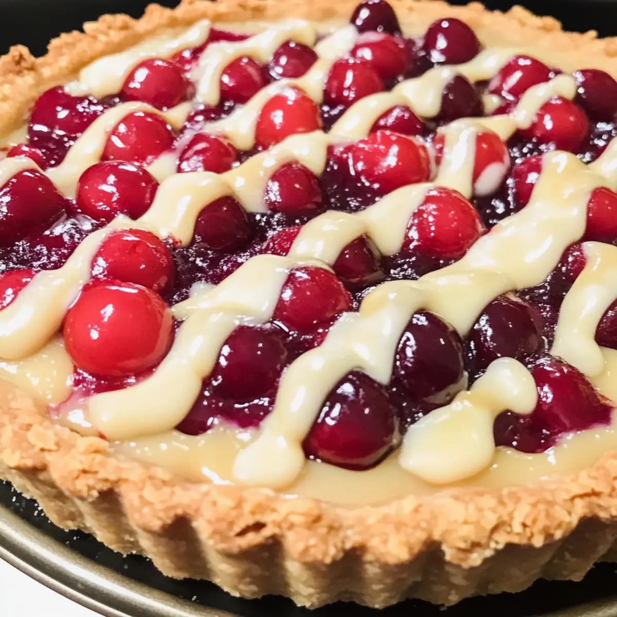 Sobald das Kirsche Vanille Buttergebäck abgekühlt ist, träufle die vorbereitete Glasur gleichmäßig über die Tarte. Diese finale Schicht wird für zusätzlichen Geschmack und eine verlockende Optik sorgen. Lass die Glasur etwas festwerden, bevor du die Tarte in Stücke schneidest und servierst.