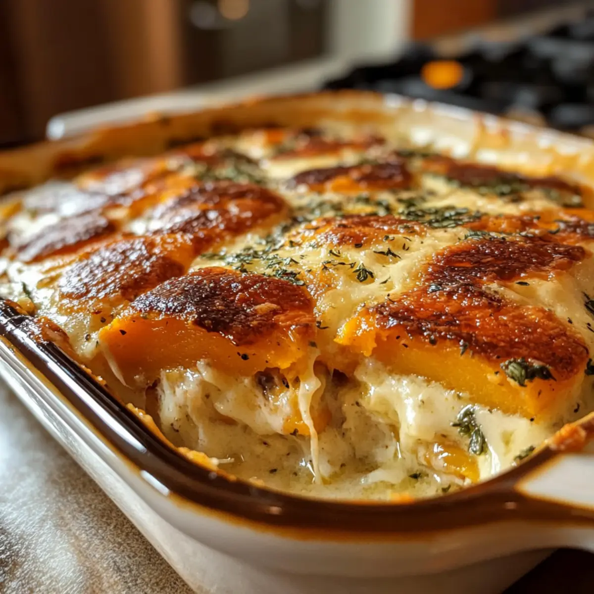 - Vorgang mit der restlichen Süßkartoffeln, Creme und Käse wiederholen.