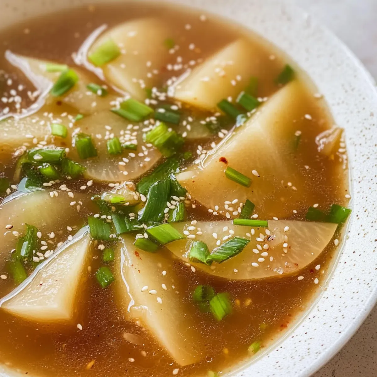 - Die koreanische Rettichsuppe ist jetzt bereit zum Servieren! Garnieren Sie sie mit Sesamkörnern und frisch geschnittenen Frühlingszwiebeln.