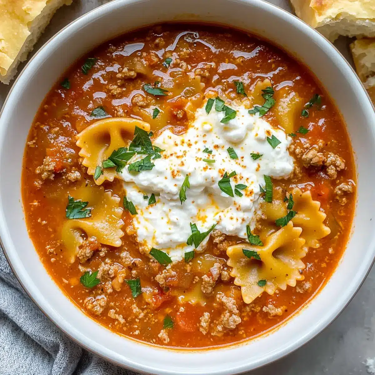 Serviere die heiß dampfende Lasagne Suppe in Schüsseln. Die beste Krönung ist ein Löffel Ricotta, eine Portion Mozzarella und frisch geriebener Parmesan obendrauf. Garniere das Ganze mit frischer Petersilie, um Farbe und Frische hinzuzufügen. Genießen Sie dieses herzhafte One-Pot-Wunder!