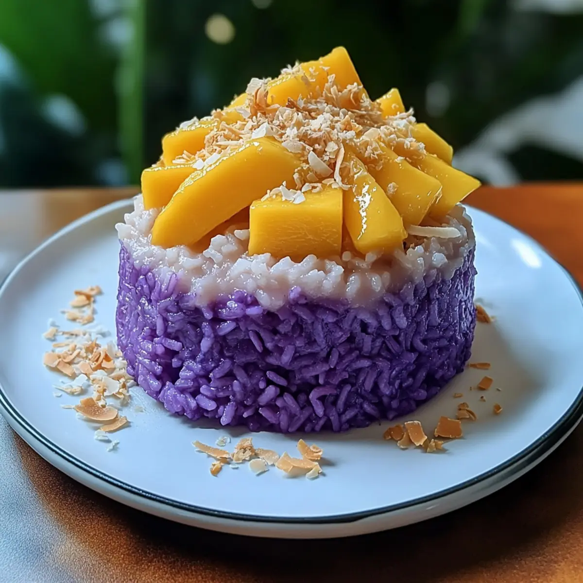 - Servieren: Verteile den Klebreis auf Tellern, garniere mit Mangostreifen und gerösteter Kokosnuss und träufle die Kokossauce darüber.