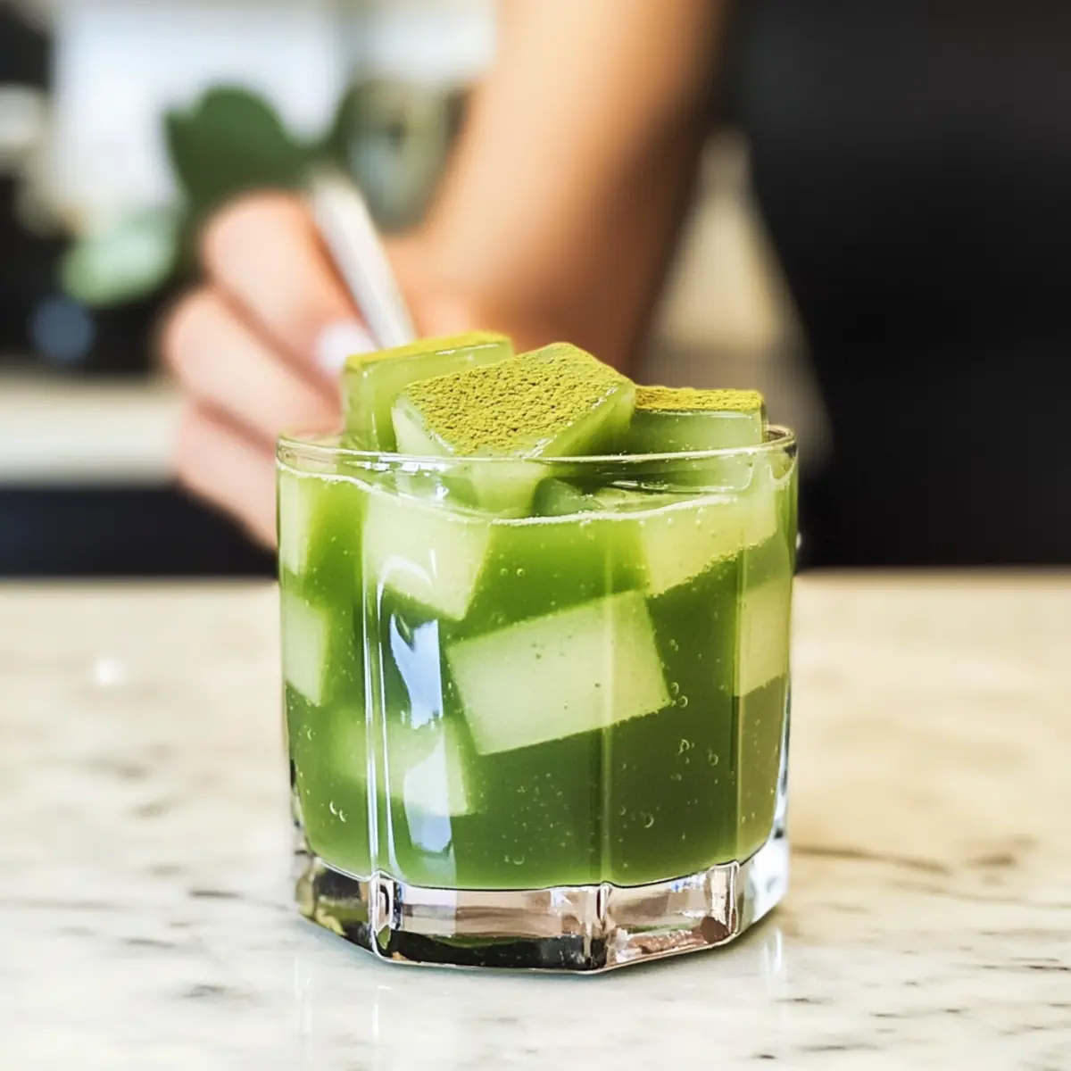 - Schichte die Geleewürfel in ein Glas, gieße die Pflanzenmilch darüber und streue optional etwas Matcha.