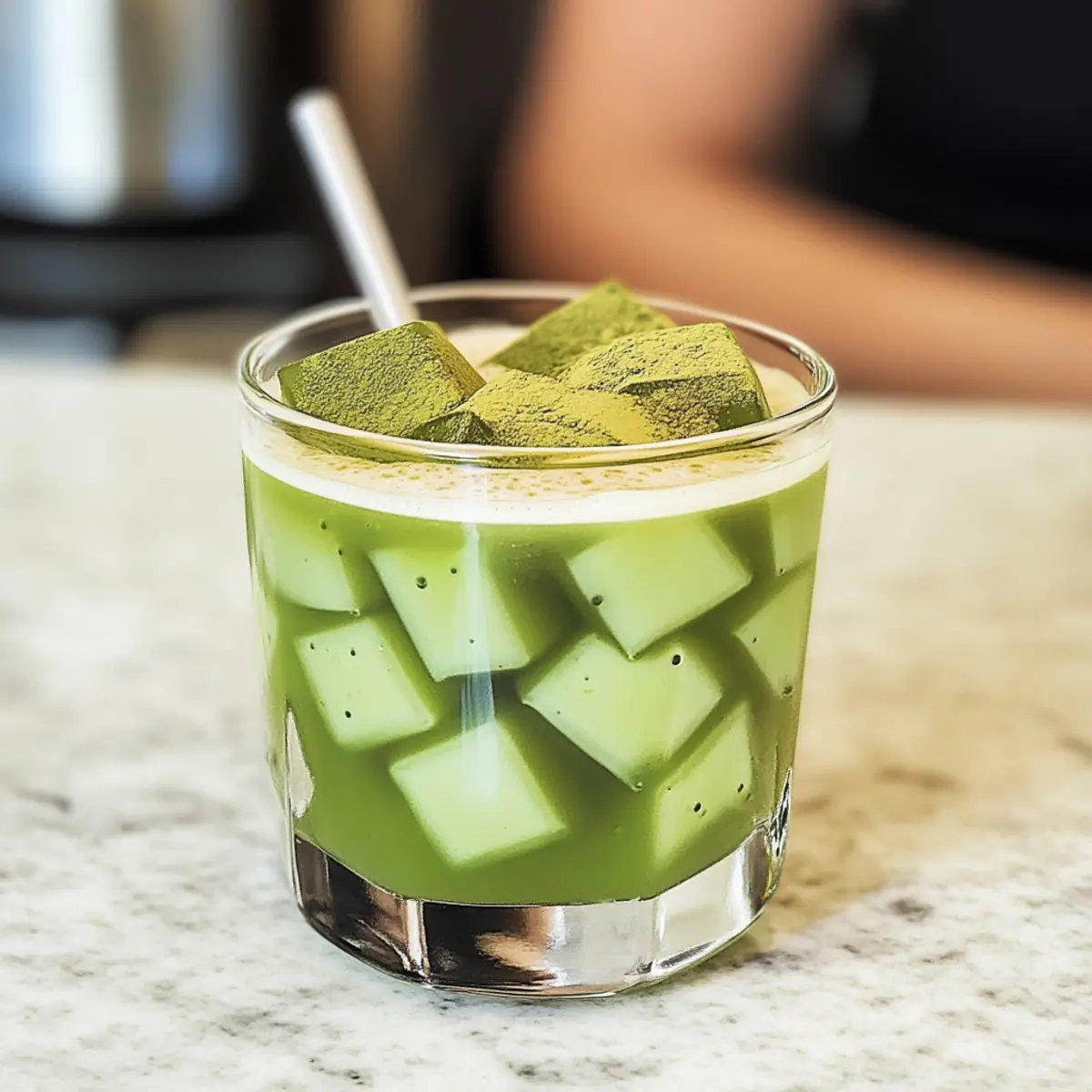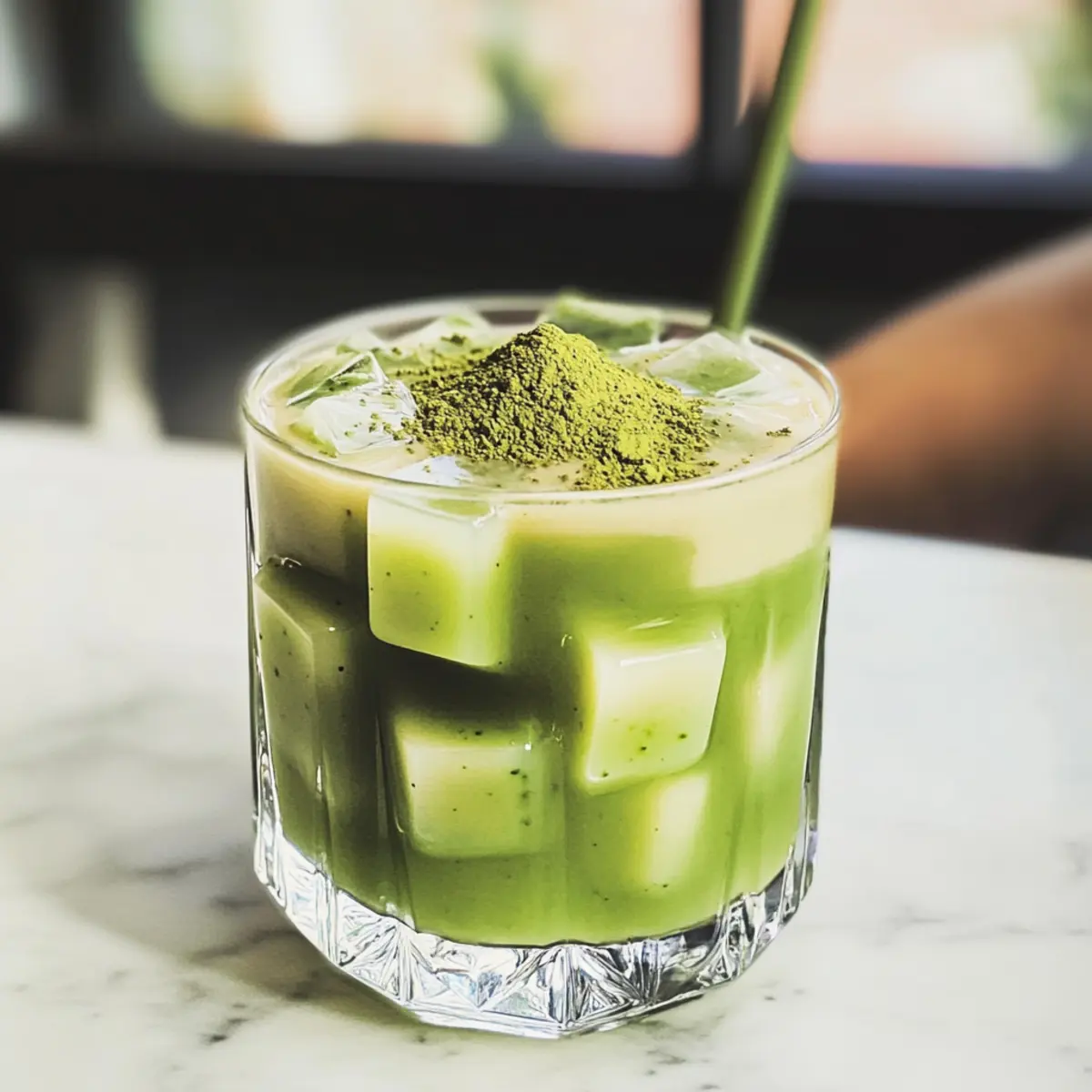 Nimm ein Glas und schichte die Matcha-Gelee-Würfel gleichmäßig am Boden. Gieße die Pflanzenmilch über die Geleewürfel, bis das Glas mehr als zur Hälfte gefüllt ist. Für den besonderen Geschmack kannst du optional etwas gesiebten zusätzlichen Matcha darüber streuen und bei Bedarf einen Hauch von Vanille-Extrakt und eine Prise Salz hinzufügen, um den Geschmack zu intensivieren.