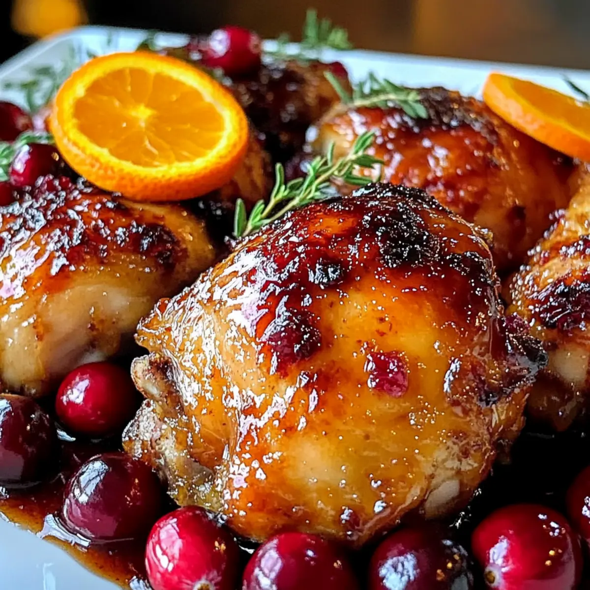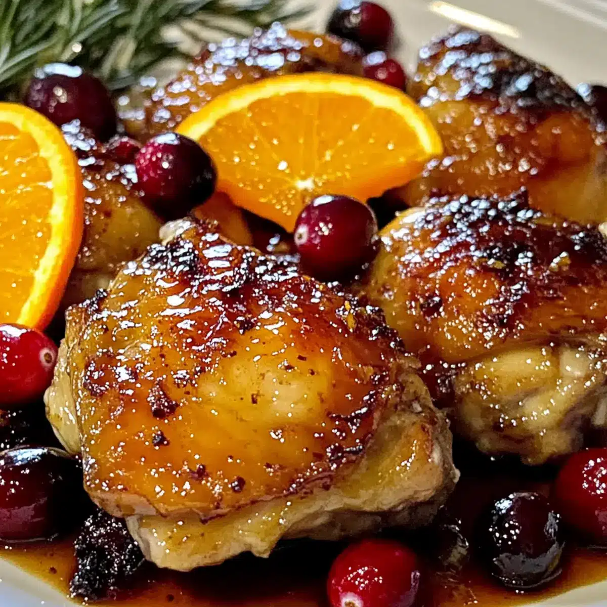 - Nehmen Sie die Auflaufform aus dem Ofen und lassen Sie das Hühnchen für 5 Minuten ruhen. Garnieren Sie mit frischen Cranberries und Orangenscheiben.