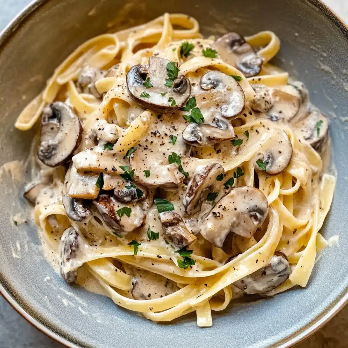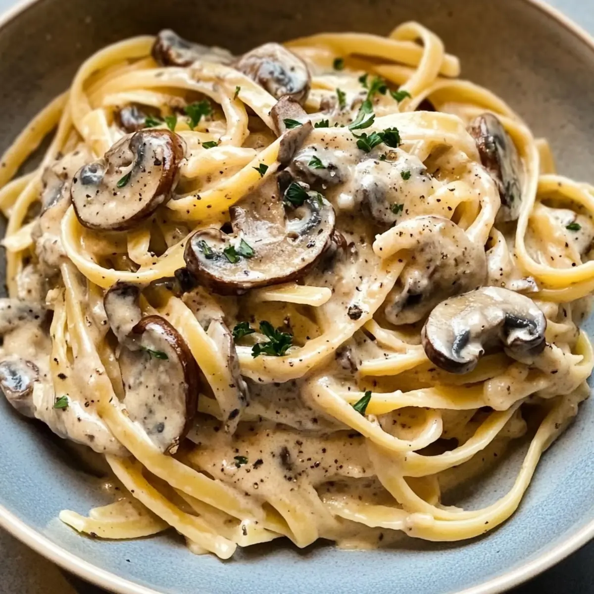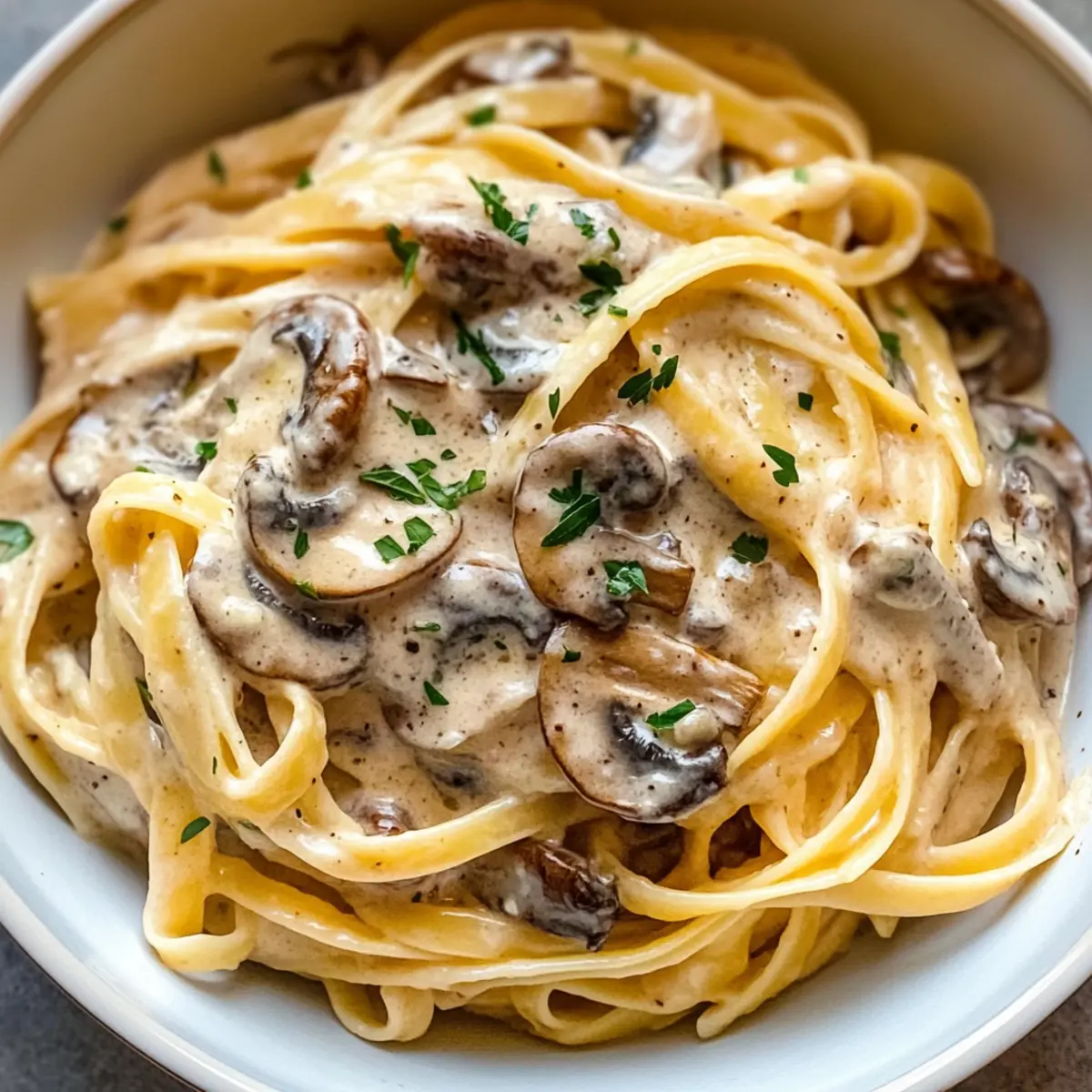 Die gekochte Pasta in die Pfanne mit der Pilzcreme geben und gut vermengen, bis die Pasta gleichmäßig mit der Sauce überzogen ist. Bei Bedarf noch etwas Hühnerbrühe hinzufügen, um die Konsistenz der Sauce anzupassen. Sofort servieren und nach Belieben mit frischer Petersilie garnieren.