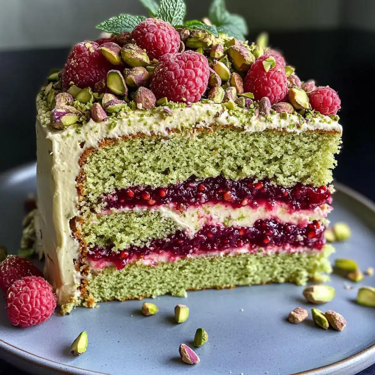 Schmücke den fertigen Pistazien-Himbeer-Kuchen mit frischen Himbeeren, gehackten Pistazien und frischer Minze als dekorativen Abschluss. So wird der Kuchen nicht nur köstlich, sondern auch ein wahrer Augenschmaus für alle Gäste!