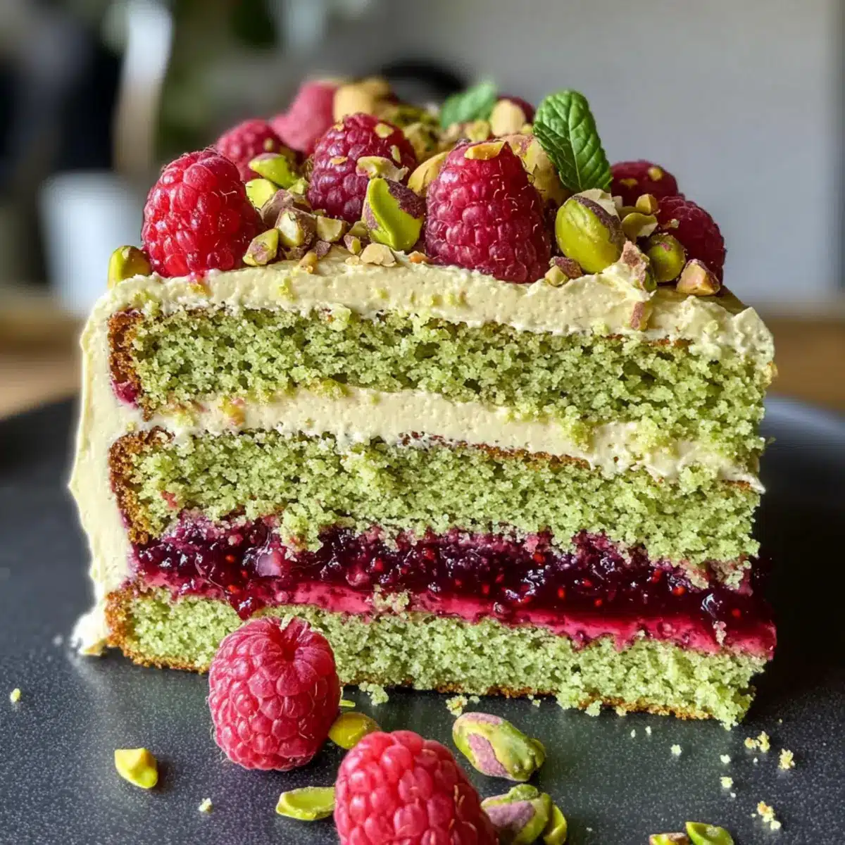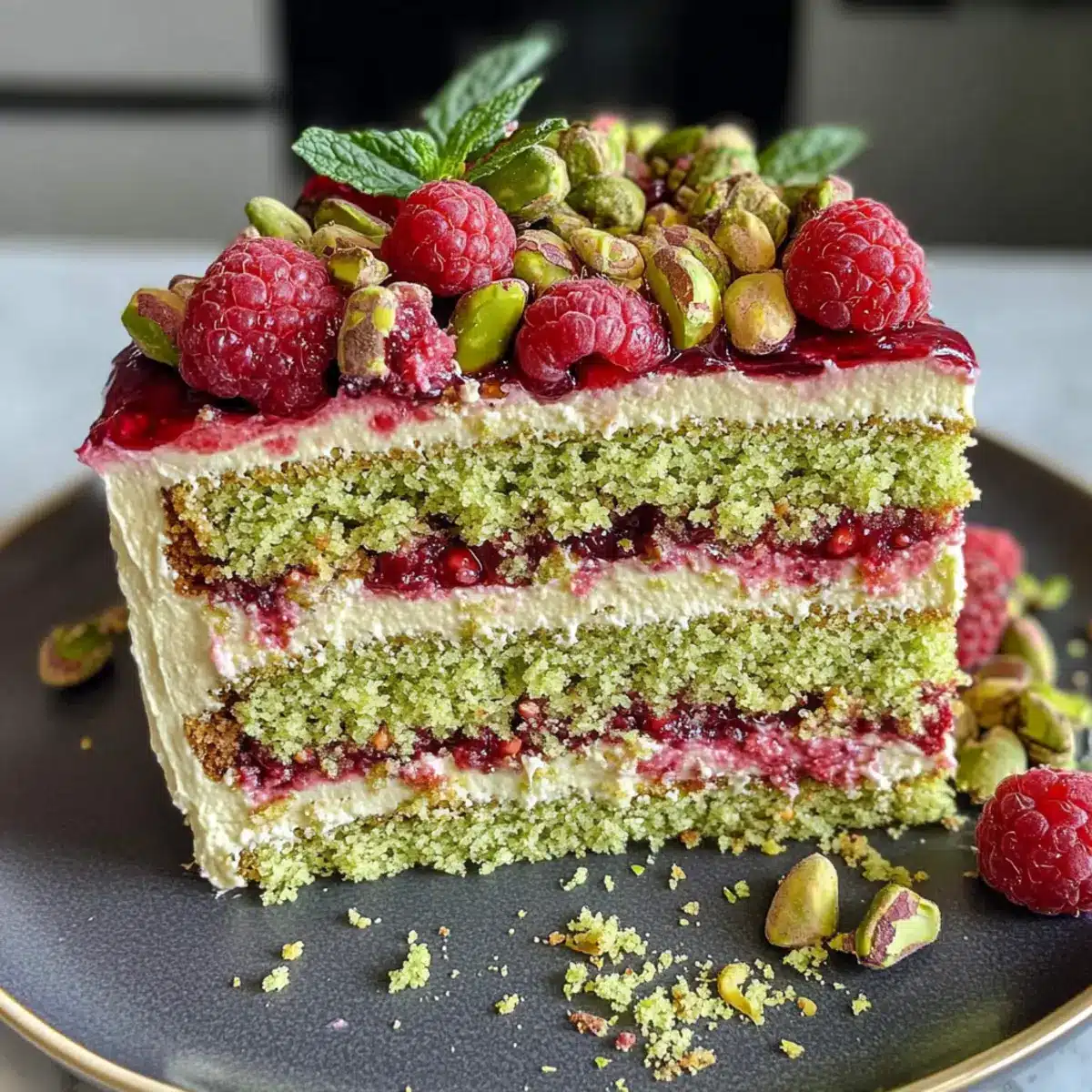 Saftige Textur: Der feuchte Pistazienboden sorgt für eine himmlische Konsistenz, die jeden Bissen zu einem Genuss macht.