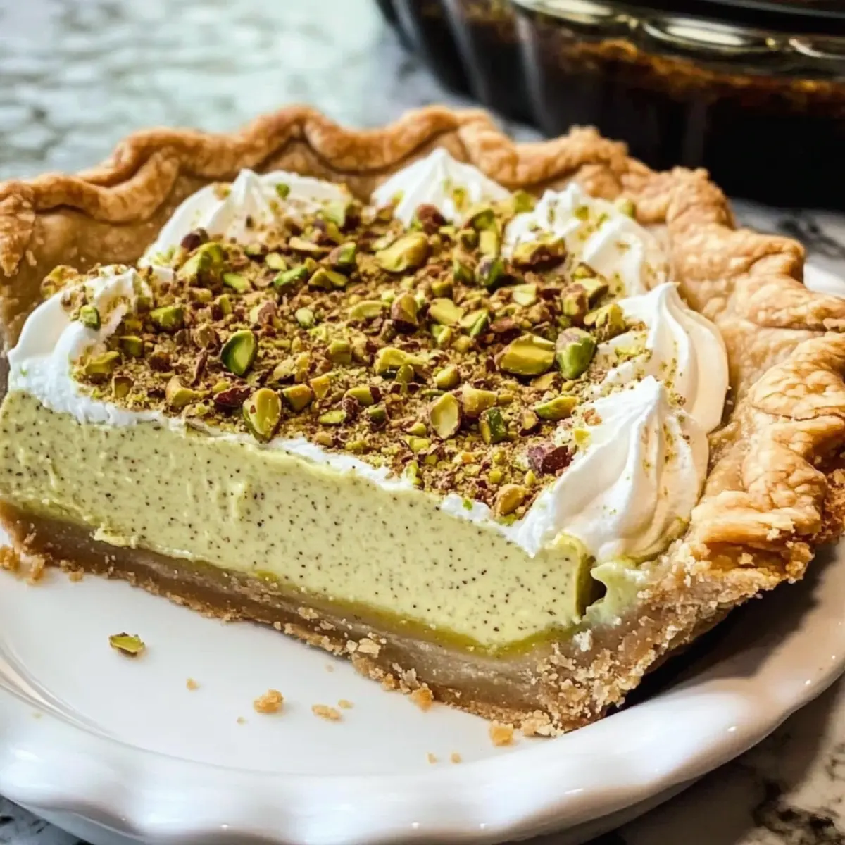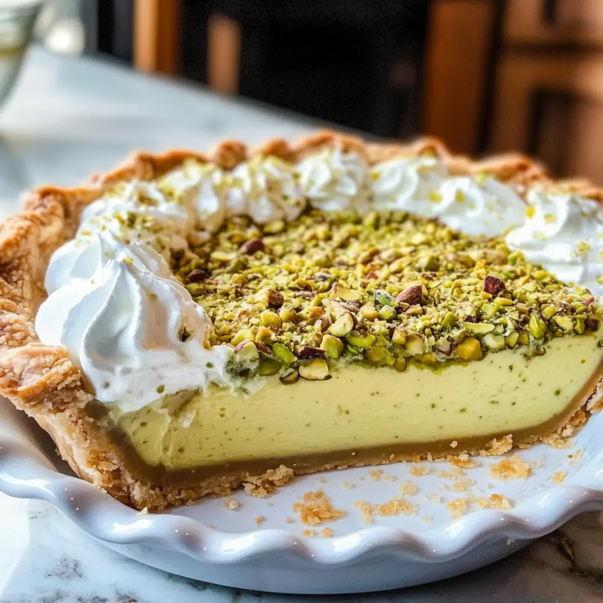 Aufwärmen: Serviere den Kuchen kalt für den besten Geschmack; die kühle Temperatur hebt die Aromen des Pistazienpuddingkuchens hervor.