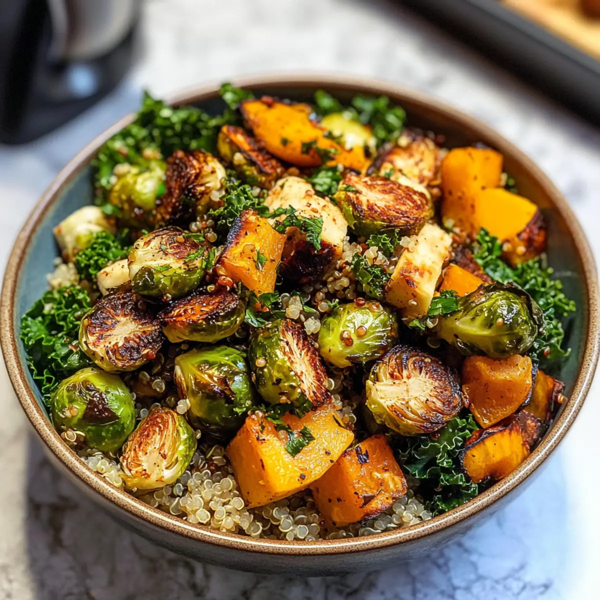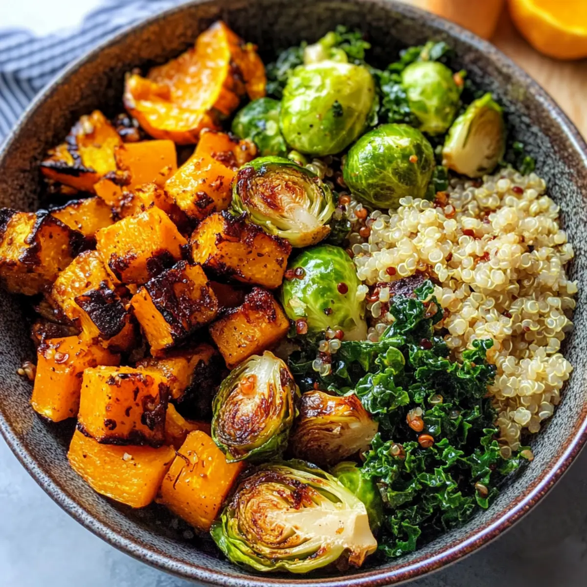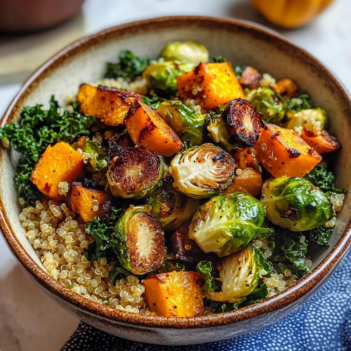 Achte darauf, dass das Gemüse frisch ist – die Rosenkohl sollten fest und knackig sein, ohne dunkle Stellen. Der Butternut-Kürbis sollte eine gleichmäßige Farbe haben und beim Klopfen einen hohlen Klang erzeugen. Wenn du selbst eine Quinoa kaufst, wähle bio-zertifizierte Körner, die klar und glänzend aussehen.