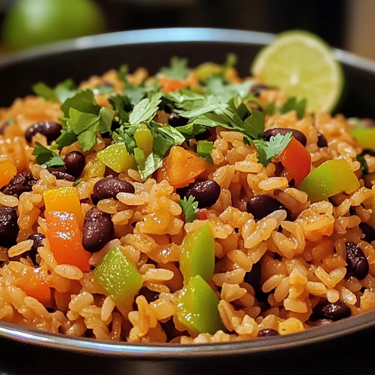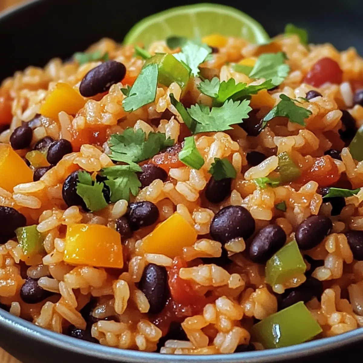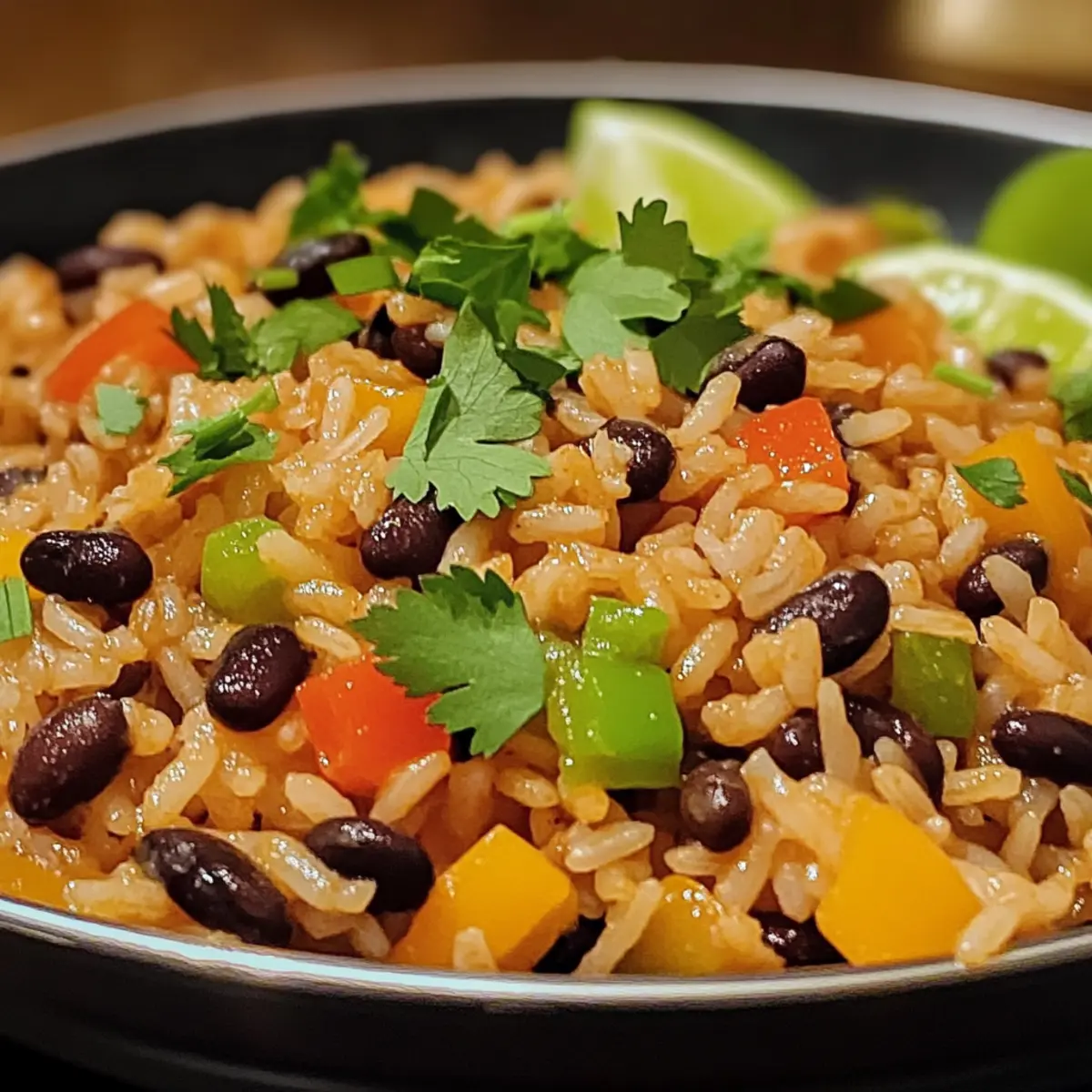 - Servieren Sie das Reis und Bohnen Gericht warm, garniert mit dem restlichen Koriander und Limettenschnitzen.