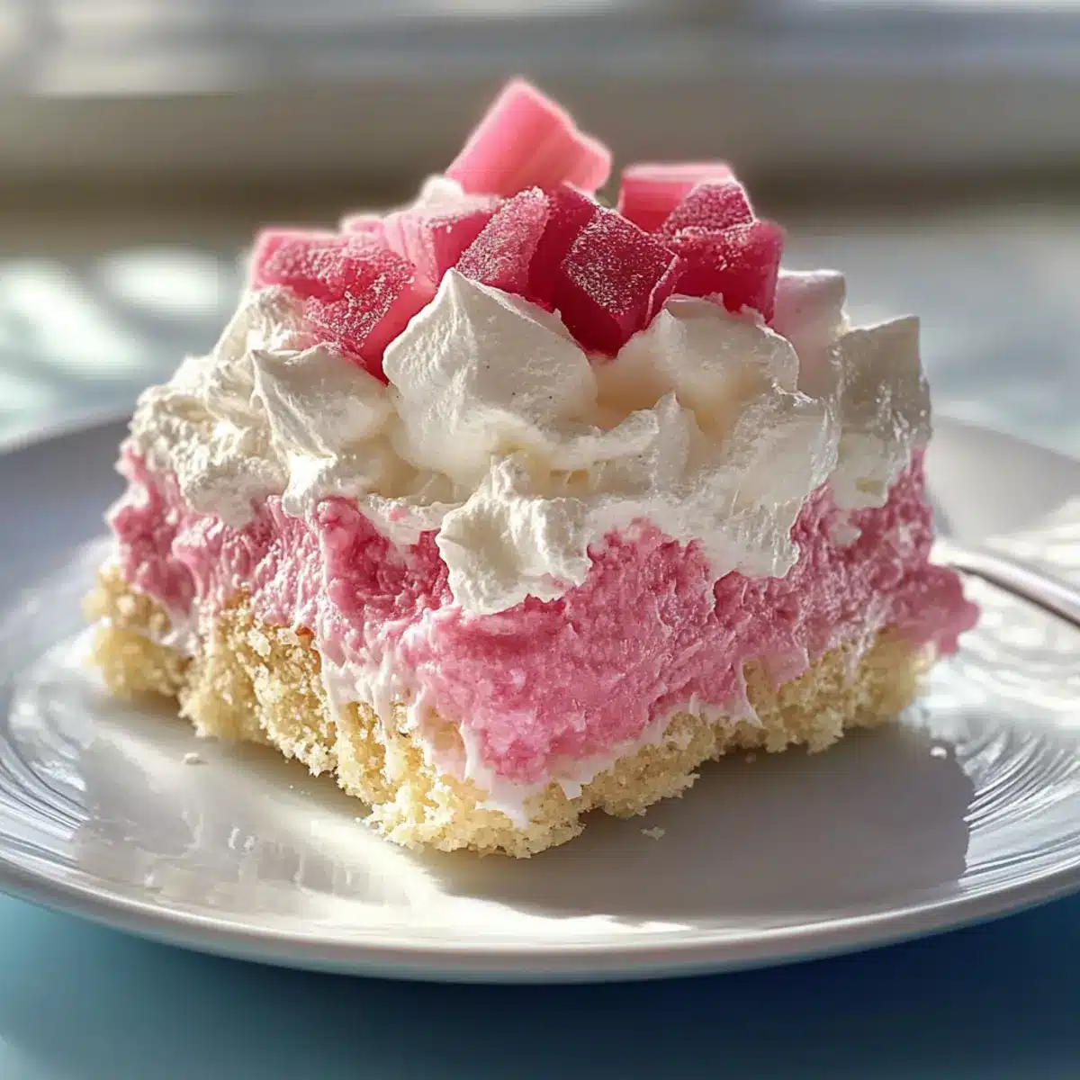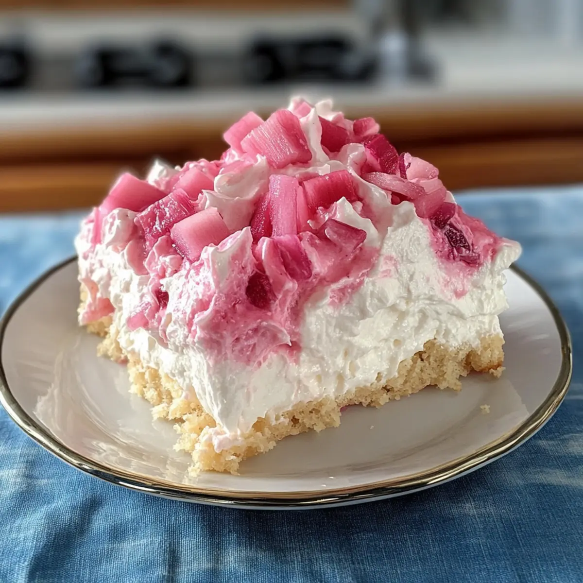 Verteile die abgetropften Rhabarberstücke gleichmäßig über den abgekühlten Boden. Achte darauf, dass der Rhabarber gut verteilt ist, sodass jeder Bissen des Rhabarberfluffs die herrliche, spritzige Note beinhaltet. Diese Schicht sorgt für einen köstlichen Kontrast zur nächsten Füllung.