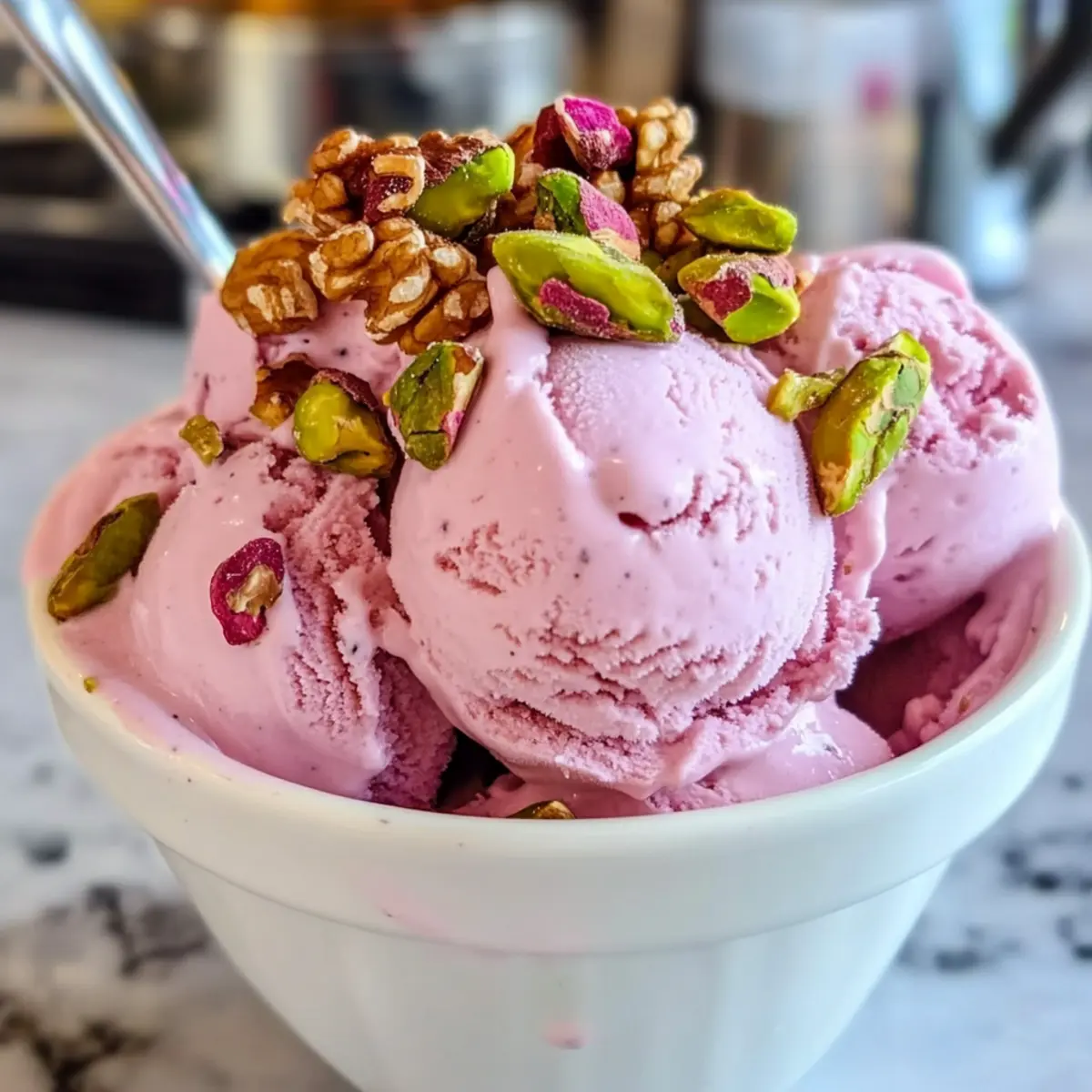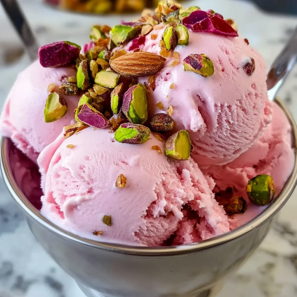 Rosen-Eiscreme mit Pistazien und Karamellnüssen